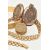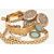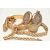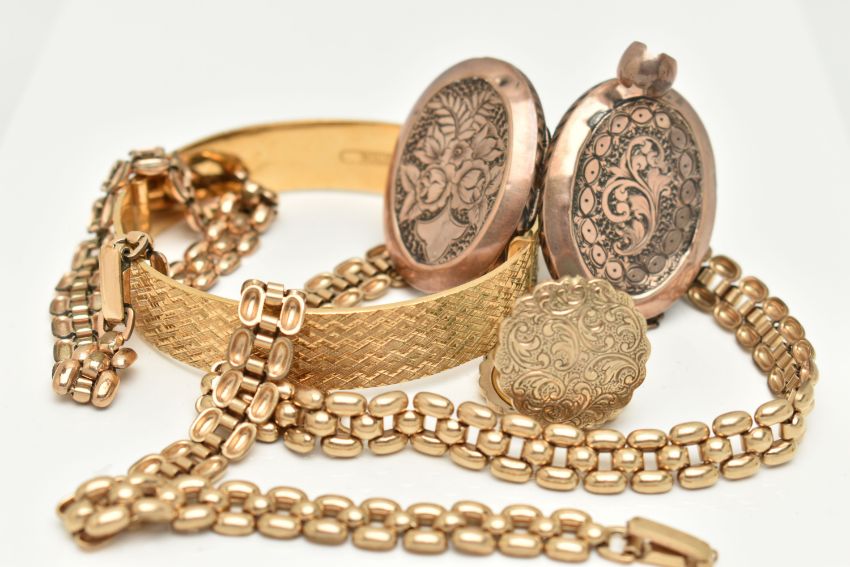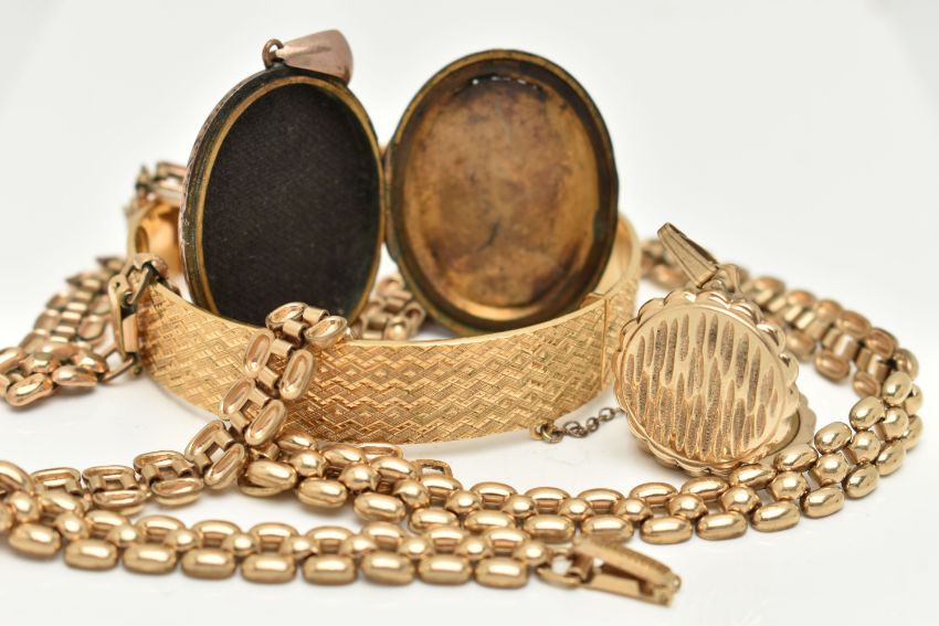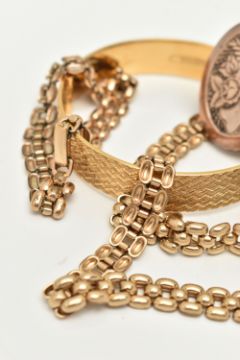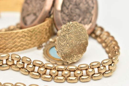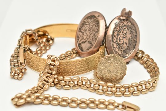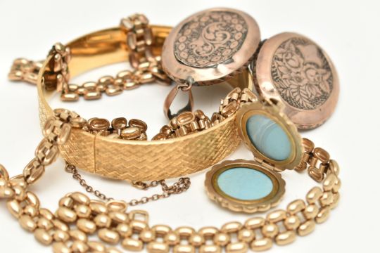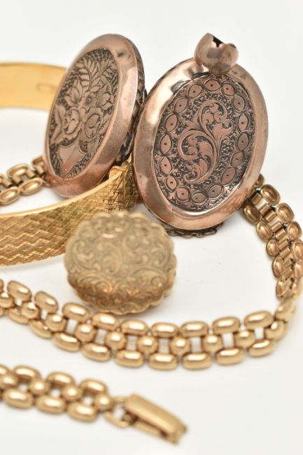 FIVE ITEMS OF GOLD PLATED JEWELLERY, to include a rolled gold brick link chain, fitted with a folding clasp, stamped 'Rolled Gold', with matching bracelet, a rolled gold hinged engine turned pattern bangle, stamped Rolled Gold, with additional safety chain, a gold front and back worn oval locket with foliate pattern, fitted with a worn tapered bail, and a yellow metal circular locket fitted with a tapered bail