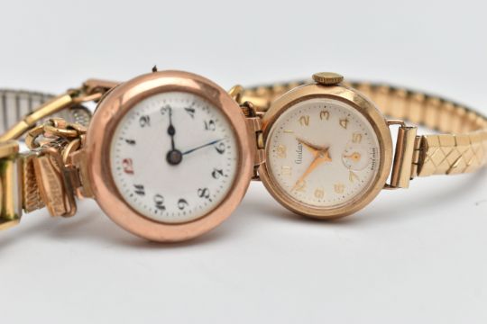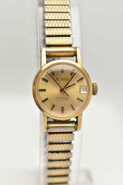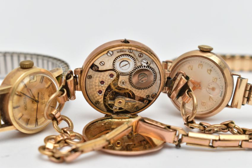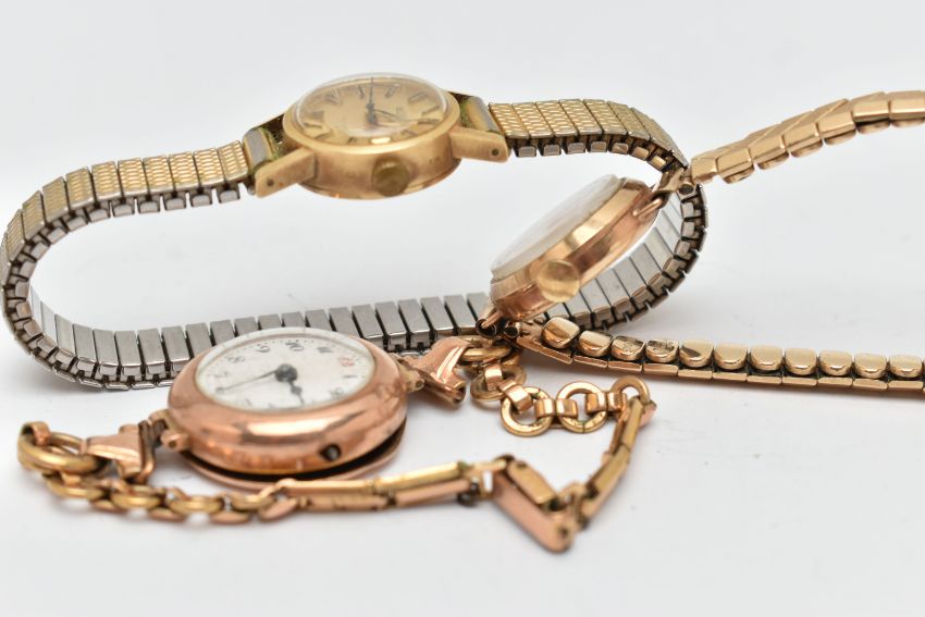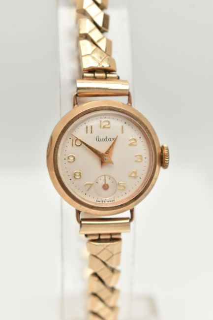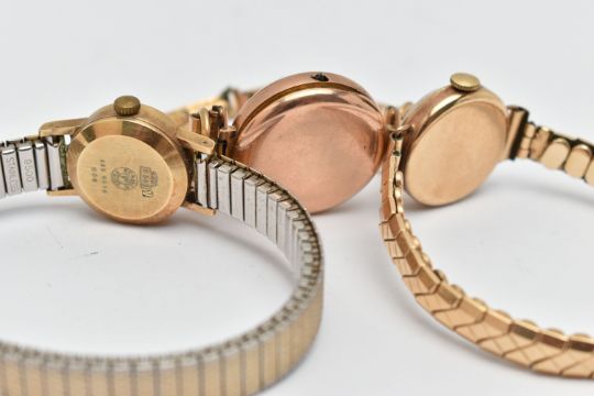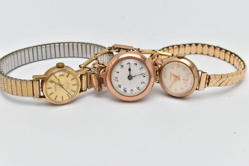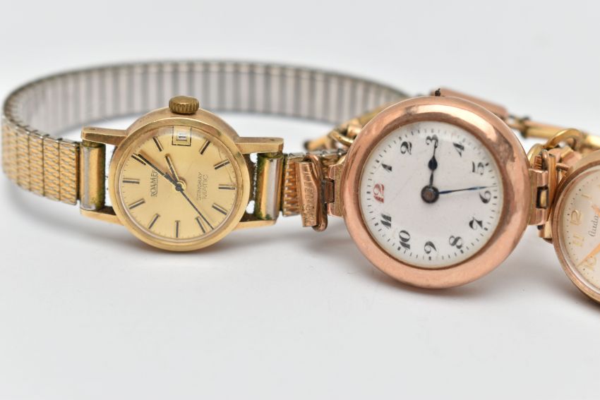 THREE LADIES WRISTWATCHES, to include a 9ct gold manual wind watch, missing crown, hallmarked 9ct London, fitted with a rolled gold bracelet, a 9ct gold 'Audaz' manual wind watch, hallmarked 9ct London, fitted with a 9ct gold back and front stretch link bracelet, the third a yellow metal 'Roamer' wristwatch, stamped 14k Swiss control marks, fitted with a stretch link bracelet (condition report: Roamer working, other two not working, require attention, we cannot guarantee the working order of any watch)
