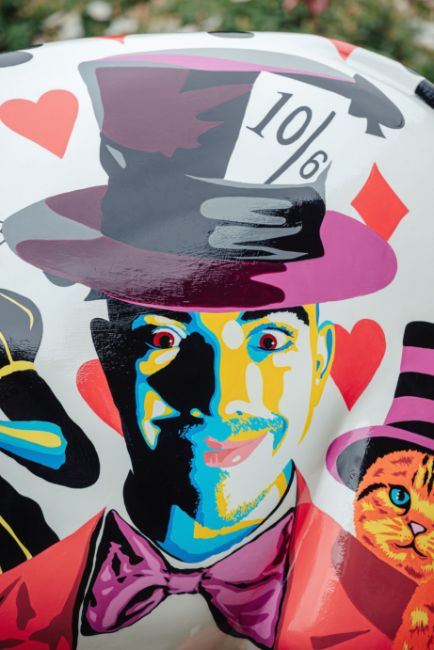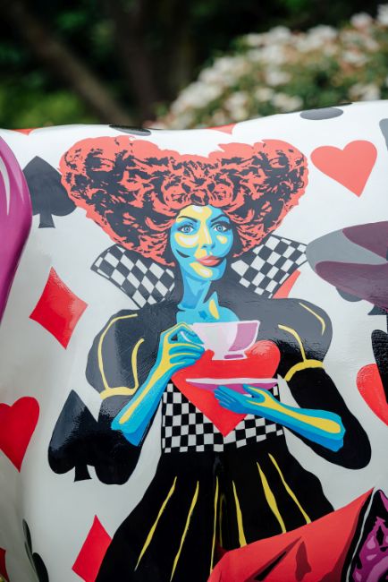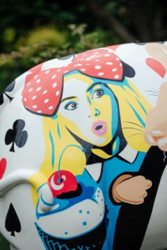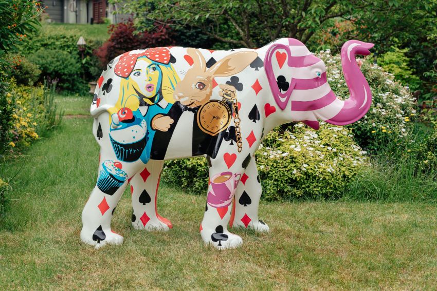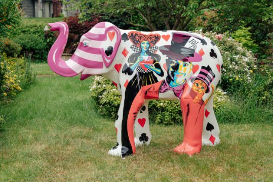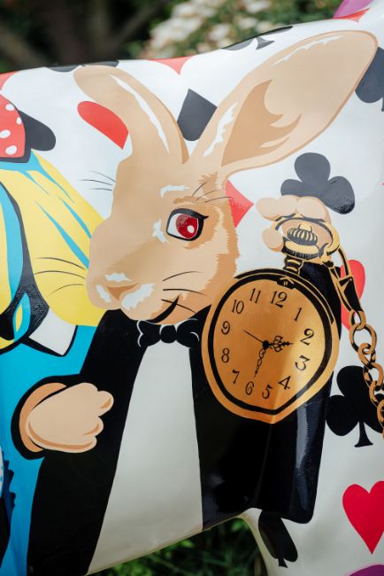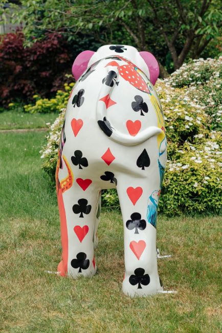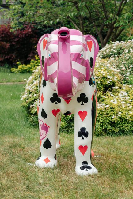 'Time for Tea' was inspired by the elephant's trunk being reminiscent of a spout. The artist wanted to design a graphic inspired by Alice in Wonderland for a while and this was their chance. A love of Pop Art comes to the fore with the design using bold, colourful images, Artist Jill Busby, sponsor Nineteen (FOR DIMENSIONS AND WEIGHT - PLEASE SEE LAST IMAGE)