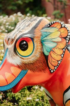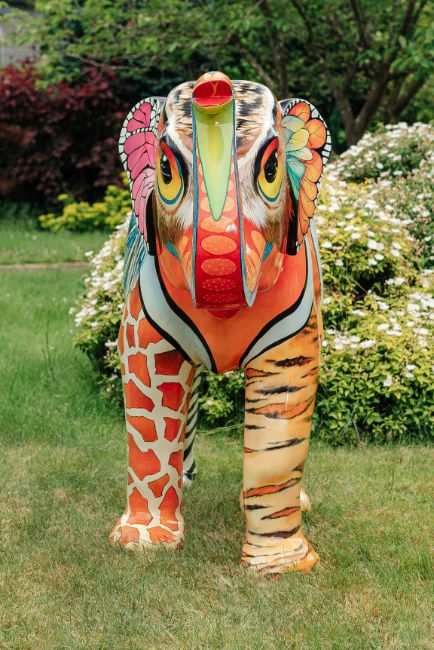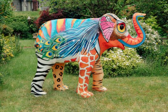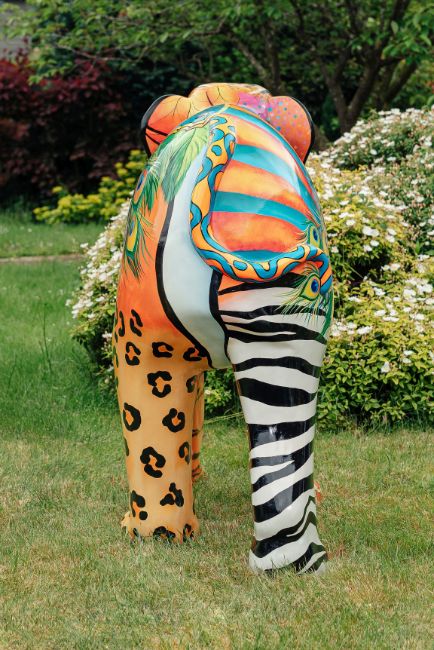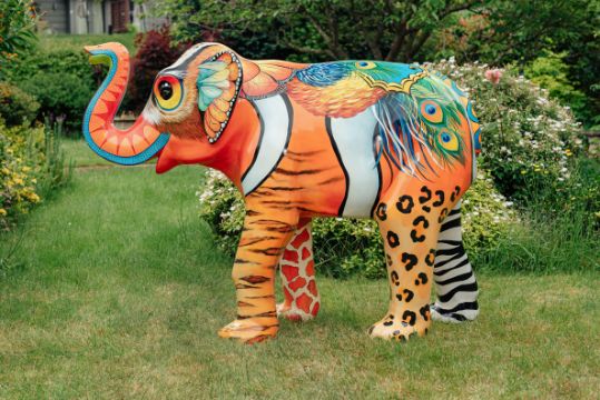 'Zoonomia' is inspired by the title of Erasmus Darwin's 18th Century book of the same title. Erasmus Darwin lived in Lichfield and was a founding member of the Lunar Society. Erasmus was Charles Darwin's Grandfather and his ideas foreshadowed modern theories of evolution. The design is a fun take on the theme with various colourful animal, bird and insect markings morphing into each other across the surface of the sculpture, Artist Sue Guthrie, sponsor Tippers (FORT DIMENSIONS AND WEIGHT - PLEASE SEE LAST IMAGE)