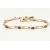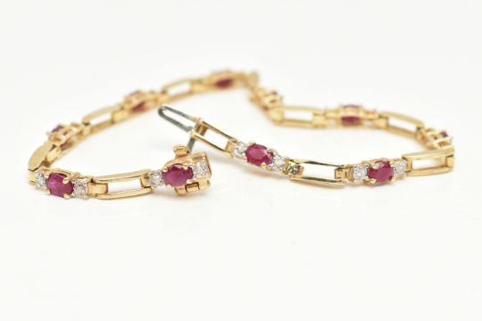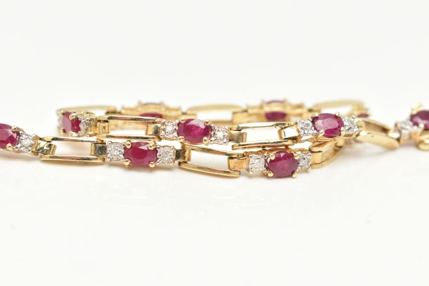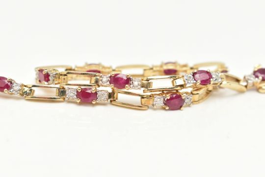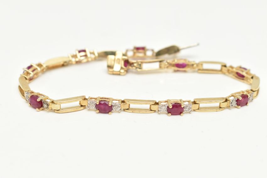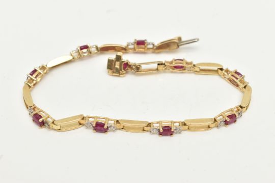A YELLOW METAL RUBY AND DIAMOND LINE BRACELET, designed as a series of open work links, interspaced with links each set with an oval cut ruby four claw set and flanked with single cut diamonds, fitted with an integrated push piece clasp with additional hinged safety clasp, stamped 10k, signed 'Nissko', length 180mm, approximate gross weight 6.2 grams (condition report: general light wear, clasp in working order)