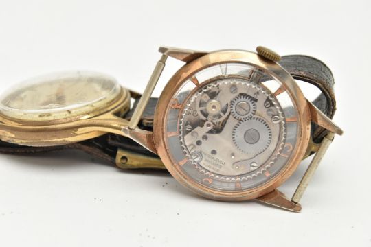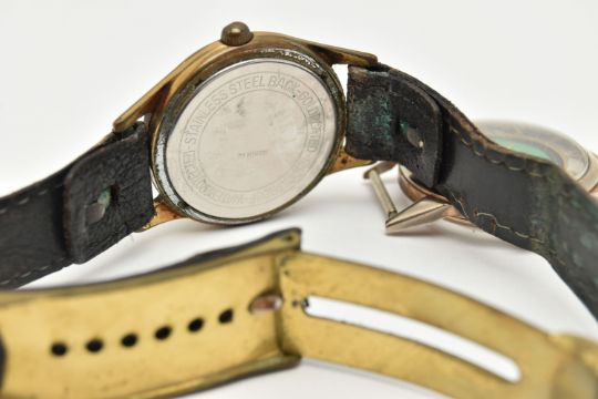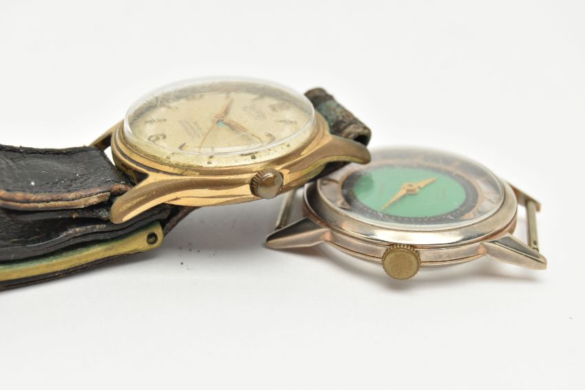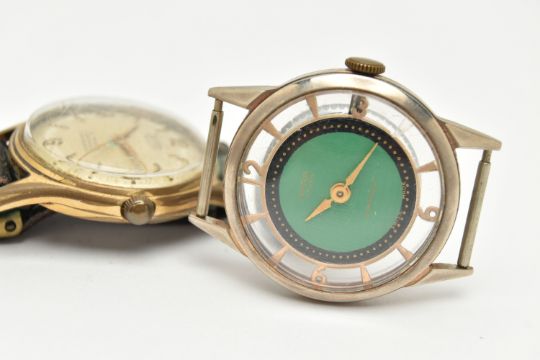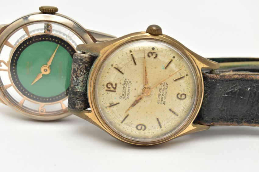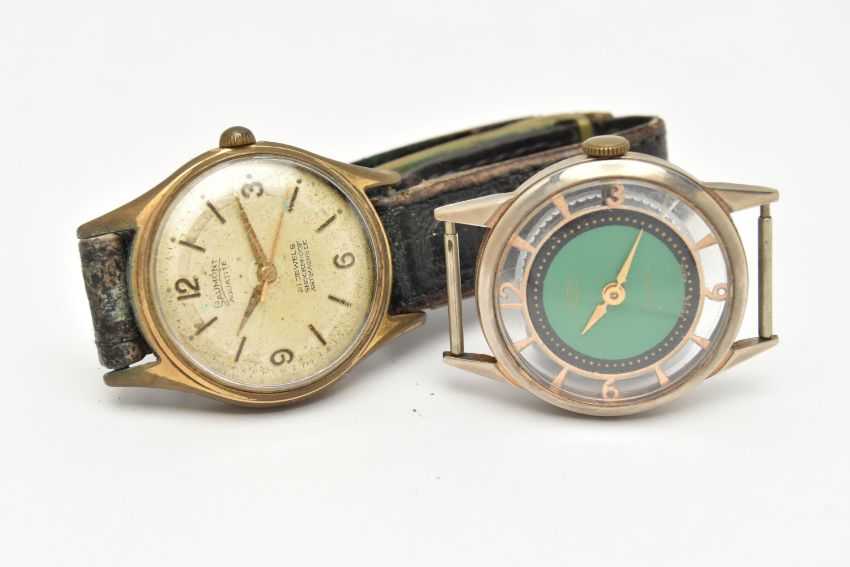 TWO WATCHES, the first a mid century hand wound movement, round green dial signed 'Wara', baton markers, Arabic numerals at the three, six, nine and twelve o'clock position, approximate case width 32mm, skeleton case back, together with a hand wound movement, round dial signed 'Saumont Aquatite', baton markers, Arabic numerals at the three, six, nine and twelve o'clock position, approximate case width 32mm, fitted with a black strap (condition report: general moderate wear, watches not currently working, we cannot guarantee the working condition of the watch)