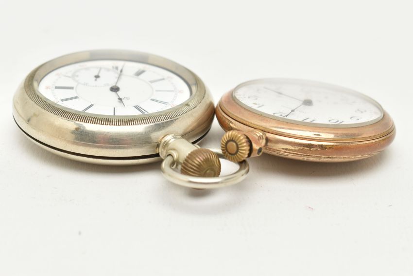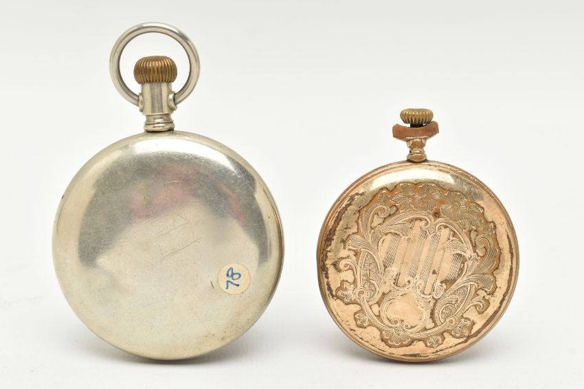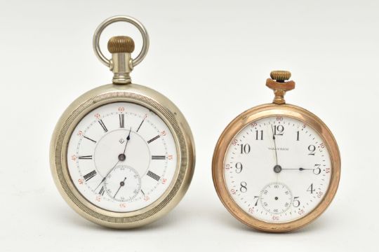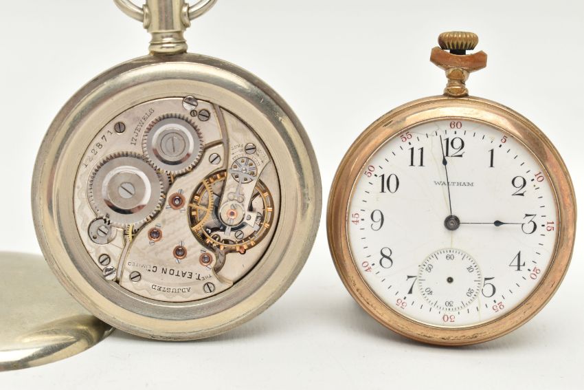 TWO POCKET WATCHES, the first a gold plated 'Waltham' open face pocket watch, manual wind, round white dial signed 'Waltham', Arabic numerals, subsidiary dial at the six o'clock position (missing hands), engraved floral case back with vacant cartouche, screw down case back, movement signed 'A.W.W.Co Waltham Mass, numbered 16714735, approximate case width 50.5mm, together with a base metal, manual wind, open face pocket watch, round white Roman numeral dial, subsidiary dial at the six o'clock position, screw down case back, movement signed 'T. Eaton Co limited' numbered 122871, approximate case width 57.4mm (condition report: Waltham not currently working, may require some attention, the second currently ticking at time of cataloguing, although time keeping is untested, we cannot guarantee the working order of any watch)