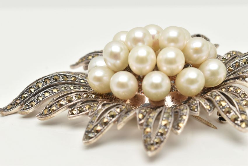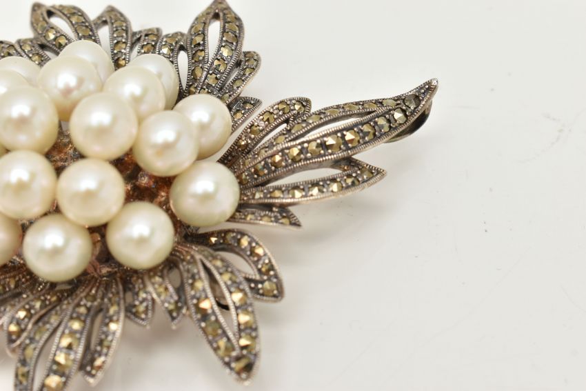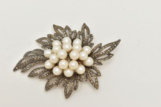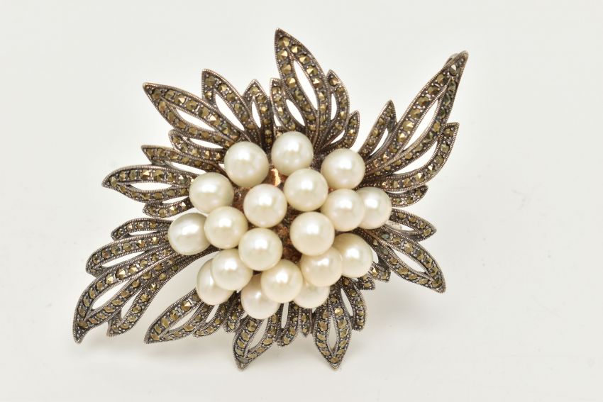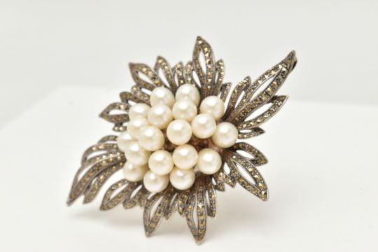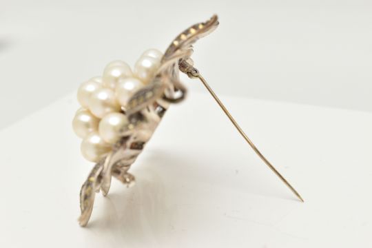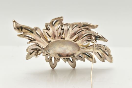 A LARGE WHITE METAL MARCASITE AND IMITATION BROOCH/PENDANT, of a spray design, unmarked, fitted with a brooch pin and safety clasp, with an additional bail to the be worn as a pendant, length 91.0mm x width 65.5mm, approximate gross weight 52. 5 grams