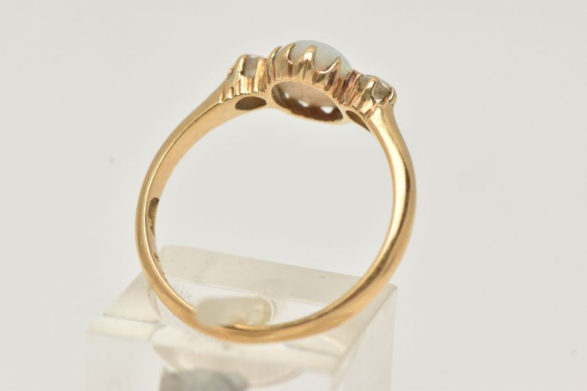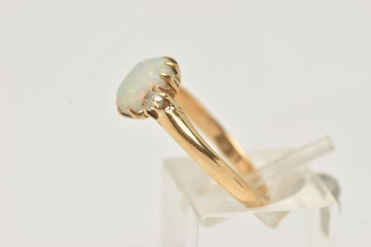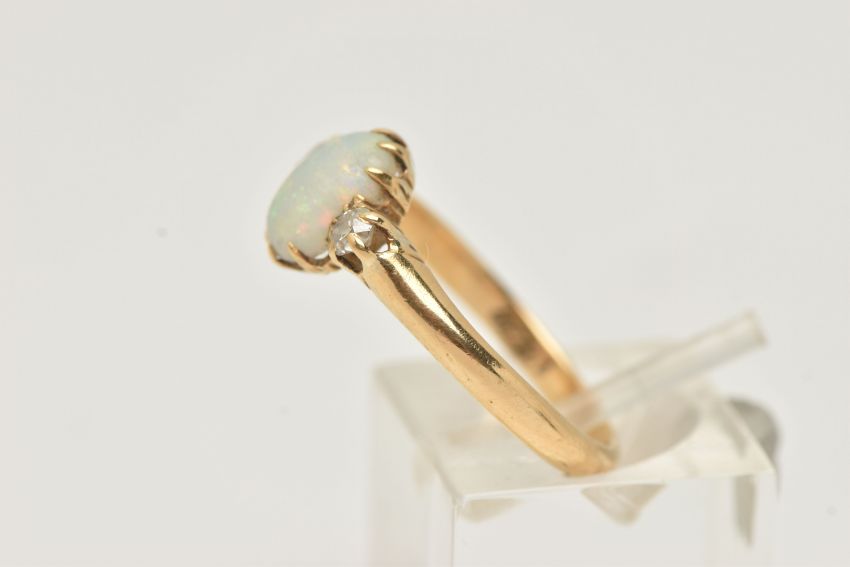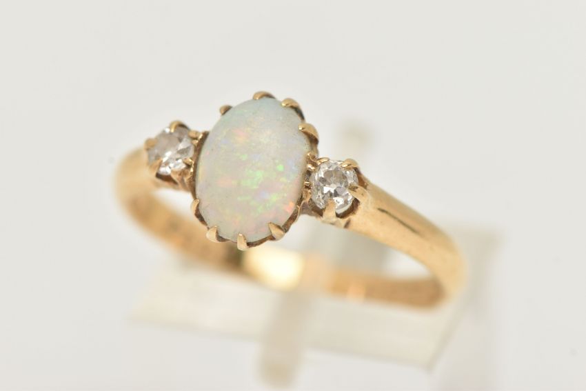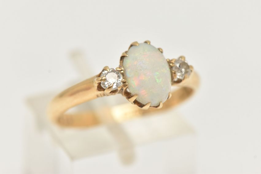 AN 18CT YELLOW GOLD, OPAL AND DIAMOND RING, designed as a central oval cut opal cabochon, claw set, flanked with two old cut diamonds, estimated total diamond weight 0.15ct, to a polished band, hallmarked 18ct Birmingham 1911, ring size P 1/2, approximate gross weight 3.2 grams (condition report: abrasion to the opal appears dull, diamonds secure, general light wear)