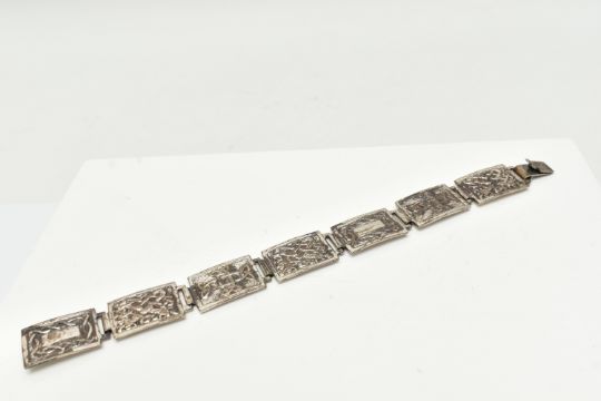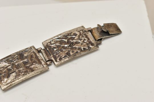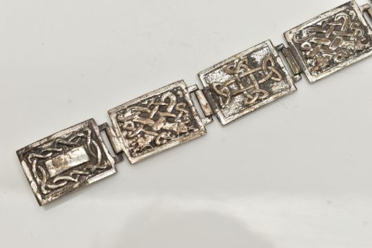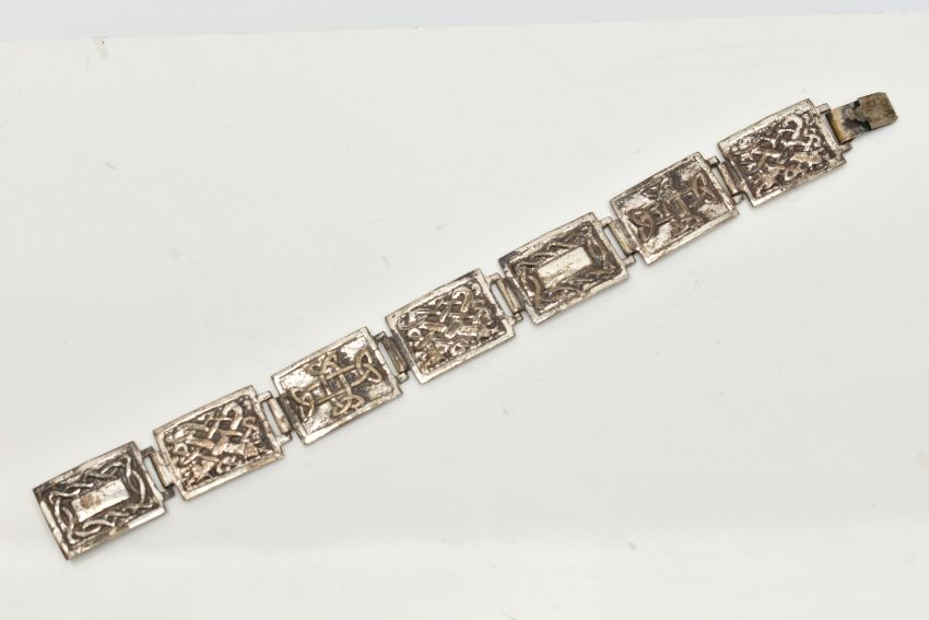 A SILVER CELTIC ARTICULATED BRACELET, designed as a series of seven rectangular panels each with a Celtic pattern, fitted with an integrated box clasp, hallmark rubbed, links stamped with sterling marks, length 210mm, approximate gross weight 41.5 grams (condition report: would benefit from a gentle clean and polish, moderate tarnishing, clasp in working order)