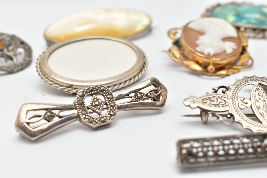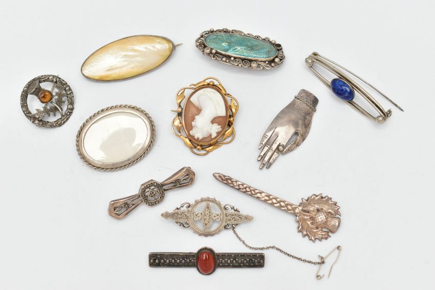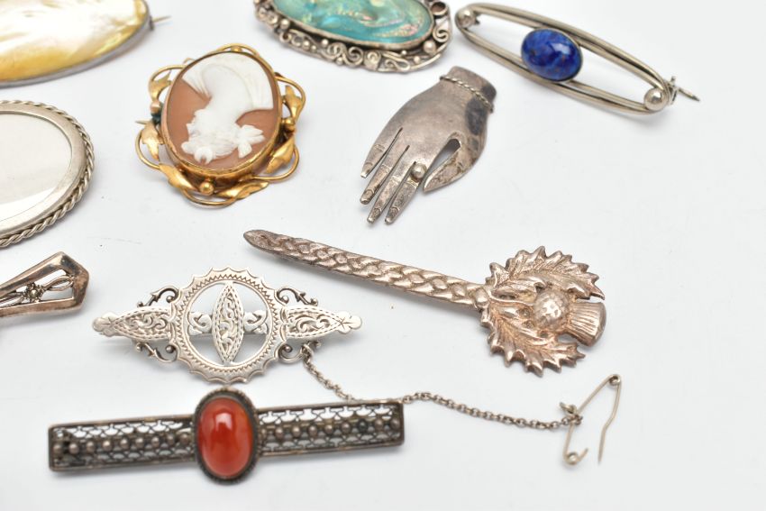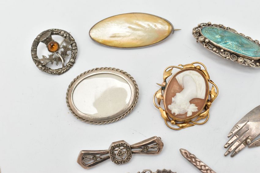 A SELECTION OF BROOCHES, to include a silver sweetheart brooch, hallmarked Birmingham, fitted with a brooch pin and C clasp with additional safety chain, a white metal photo brooch stamped 925, a shell brooch in a white metal mount, a gilt metal cameo brooch, a white metal hand brooch, thistle brooch, blue glass cabochon set brooch, a white metal marcasite set brooch, a carnelian cabochon set brooch and another thistle brooch stamped silver