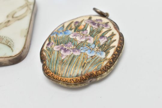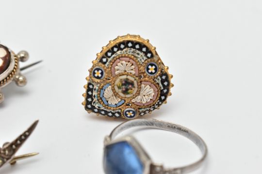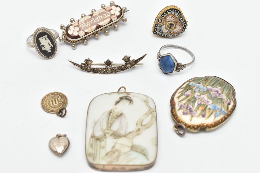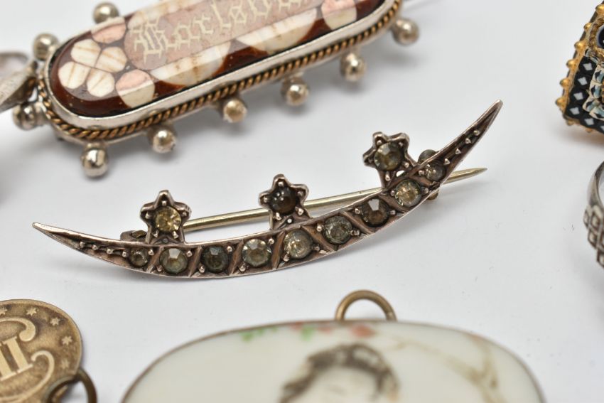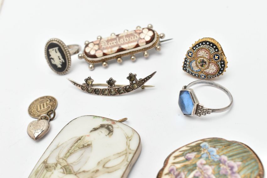 A SMALL BAG OF WHITE METAL JEWELLERY, to include a silver crescent brooch set with colourless paste, fitted with a brooch pin and C clasp, hallmarked Birmingham, a white metal black and white 'Wedgwood' ring, stamped Sterling Silver, ring size K 1/2, a white metal hardstone sweet heart brooch, with applied bead work surround, fitted with a brooch pin and C clasp, unmarked, a white metal butterfly wing ring, stamped Silver, a white metal painted ceramic oriental pendant, a white metal floral painted pendant, fitted with a jump ring for suspension, a heart pendant, coin pendant and a micro mosaic heart pendant