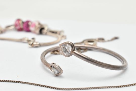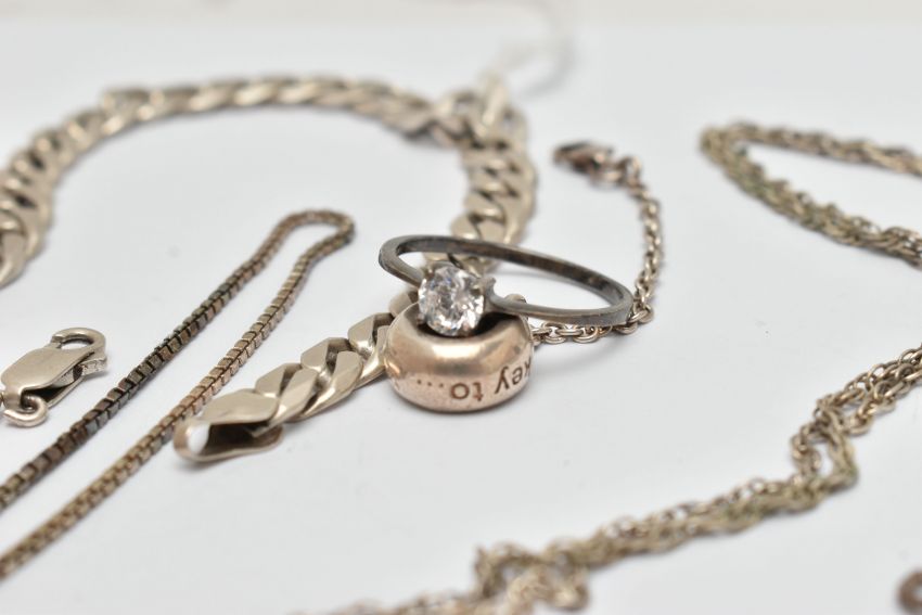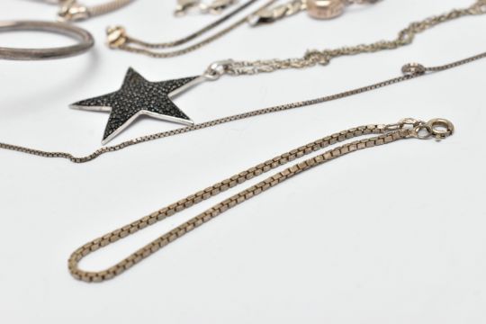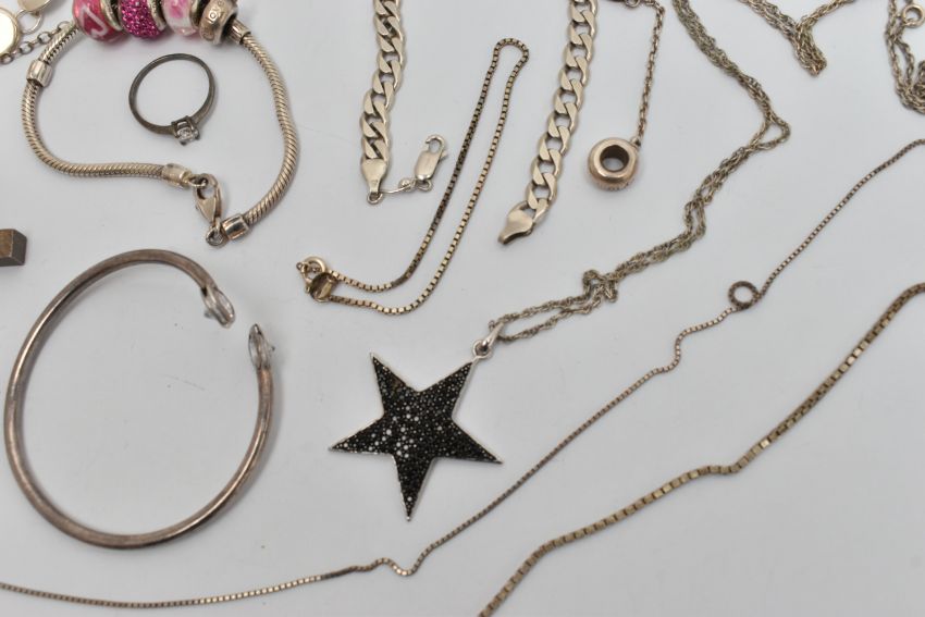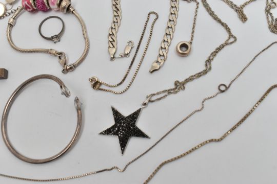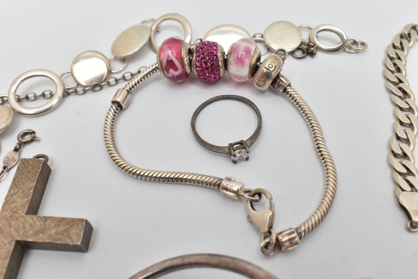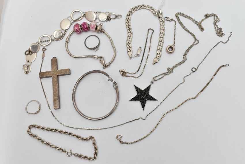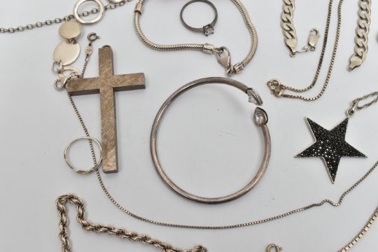 A SELECTION OF SILVER AND WHITE METAL JEWELLERY, to include a large textured silver cross pendant, hallmarked Birmingham, fitted with a suspension loop, length 68mm, a silver curb link bracelet with an AF lobster clasp, hallmarked London, approximate gross weight 53.6 grams, together with five bracelets, a snake charm bracelet, a bangle, a star pendant with chain, a fine box link chain, two white metal rings and a single charm some with marks to indicate silver i.e. 925/silver
