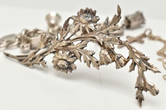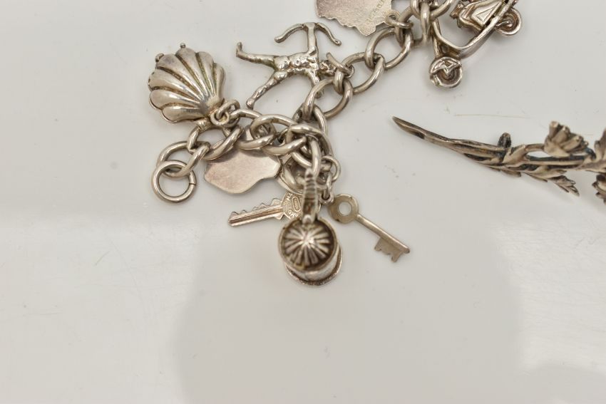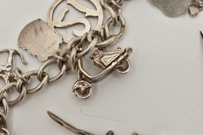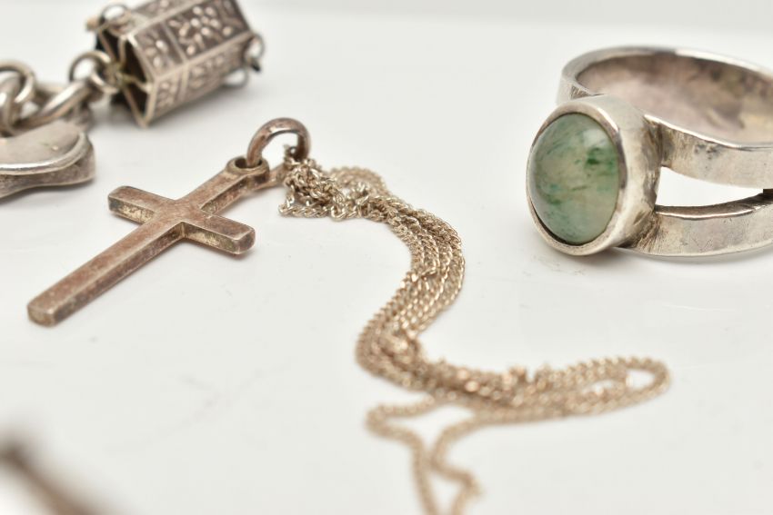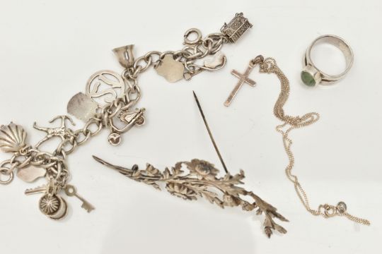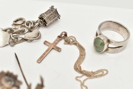 A SMALL BAG OF WHITE METAL JEWELLERY, a silver curb link bracelet, links stamped with sterling marks, multiple charms in forms such as enamel shields, bell, guitar, tankard, shell, keys etc some with marks to indicate silver others unmarked, fitted with a spring clasp, length 190mm, a white metal ring set with an oval cut aventurine cabochon, unmarked, a white metal floral brooch, unmarked fitted with a brooch pin and C clasp, and a white metal cross pendant with fine curb link chain stamped 925