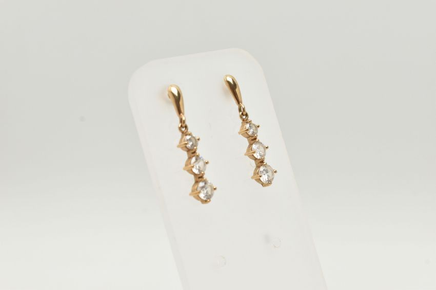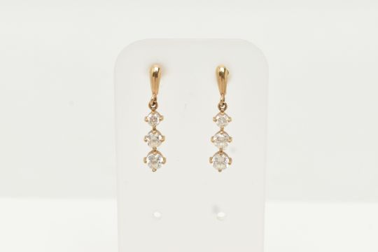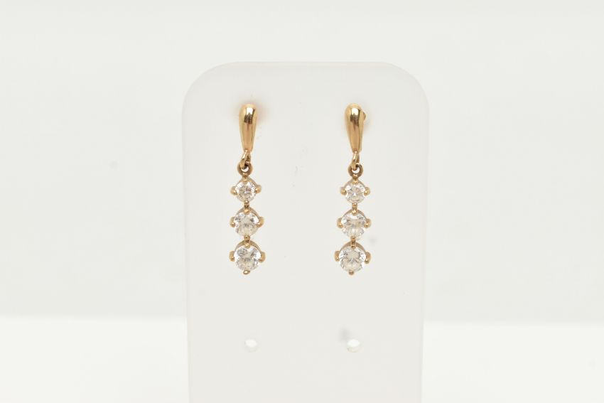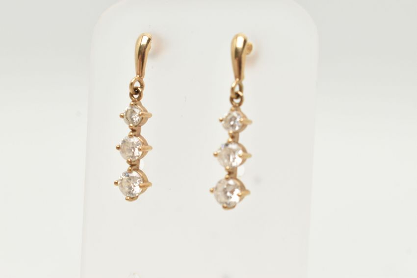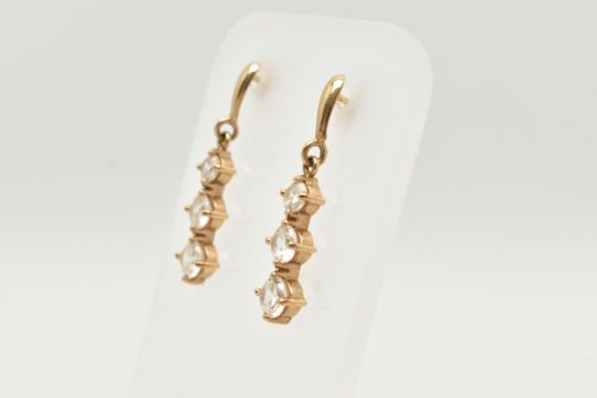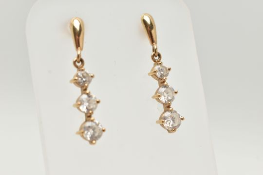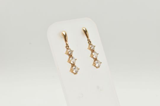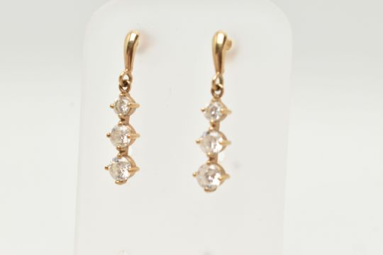 A PAIR OF YELLOW METAL CUBIC ZIRCONIA DROP EARRINGS, designed as a row of three graduated colourless, cubic zirconia, each in a claw setting, to the post and scroll fittings, worn hallmark to the posts, drop length 29mm, approximate gross weight 2.8 grams (condition report: general light wear, scrolls do not match)
