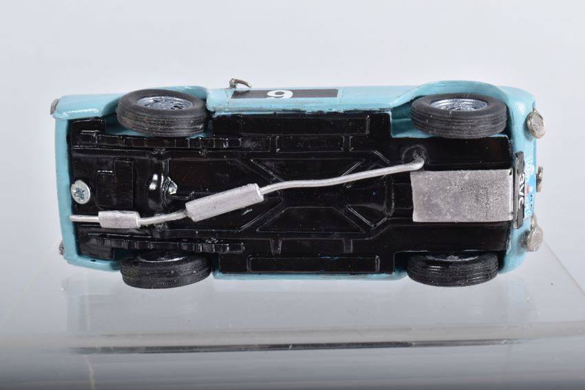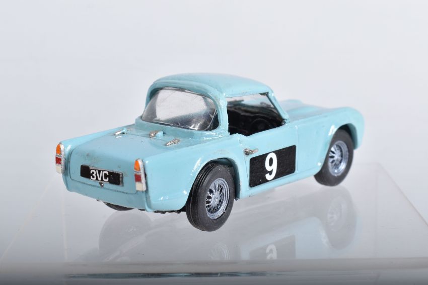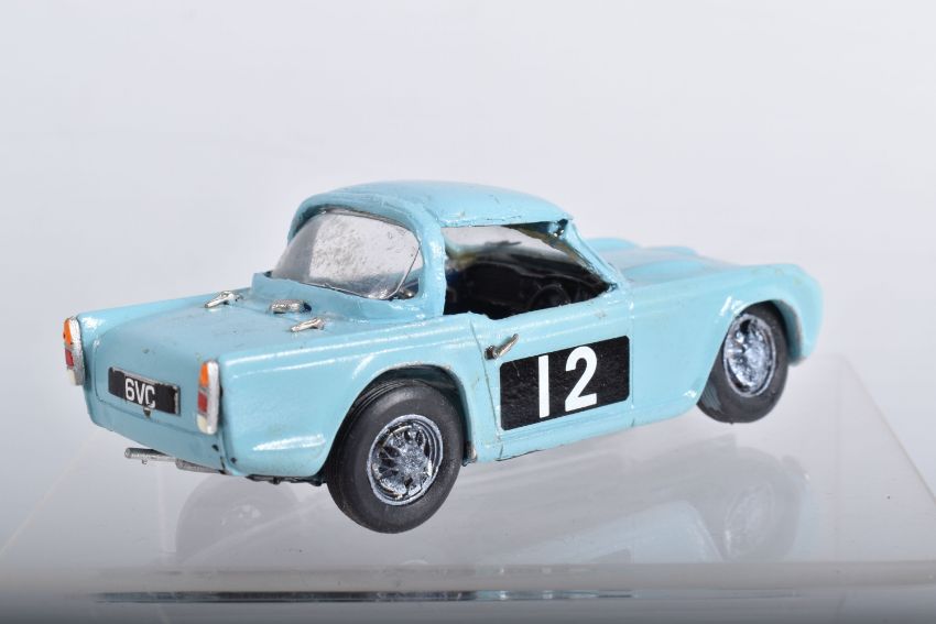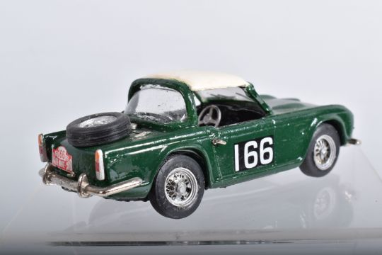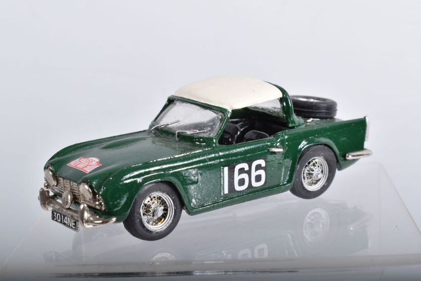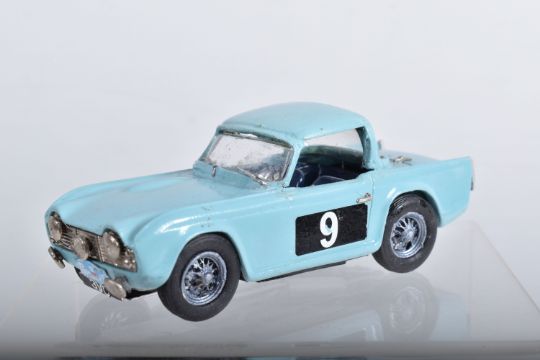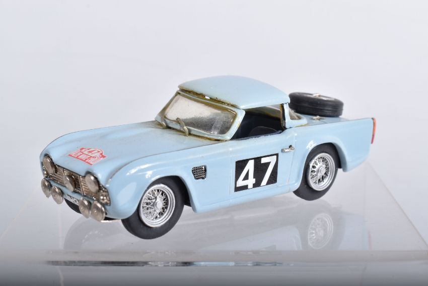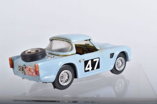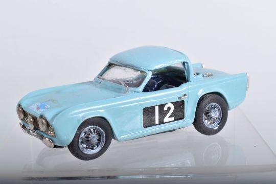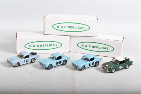 FOUR CONSTRUCTED K & R REPLICAS TRIUMPH TR4 SPORTS CAR MODEL KITS, all 1/43 scale white metal kits that have been constructed and finished to a good standard, 1962 Coupes De Alps cars, powder blue hardtops RN9, Reg. No. 3 VC and RN12, Reg. No. 6 VC, 1963 Monte Carlo Rally cars, powder blue hardtop RN47, Reg. No. H 31 and British racing green with white hardtop RN166, Reg. No. 3014 NE, all in very good condition, three boxed with instructions, Monte Carlo car RN47 unboxed