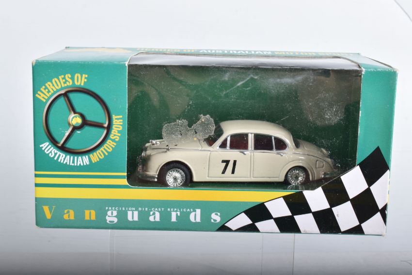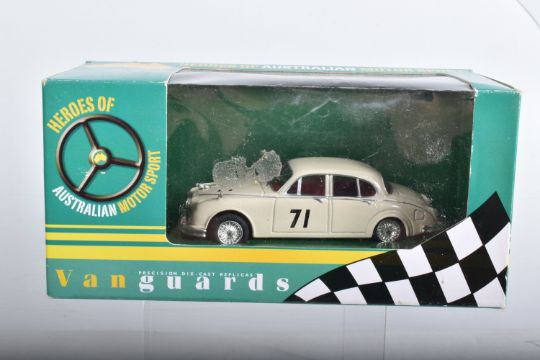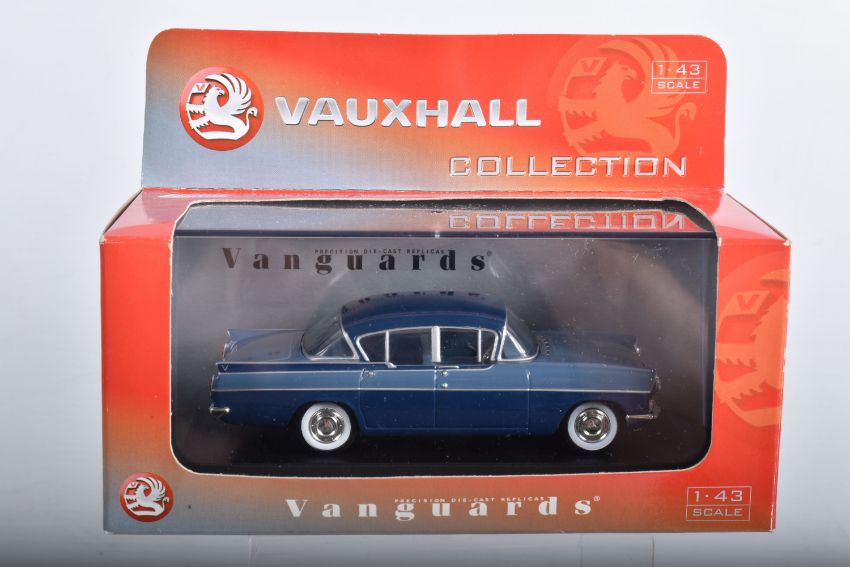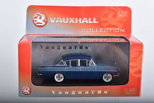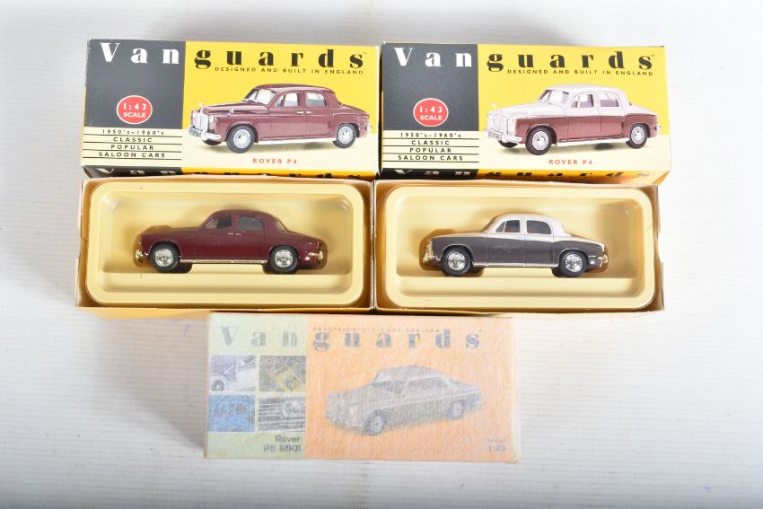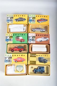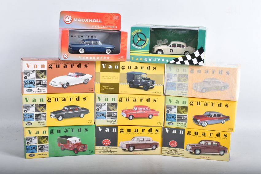 ELEVEN BOXED 1:43 SCALE VANGUARDS DIECAST MODEL VEHICLES, the first a VA38000 Gypsy Red Vauxhall Victor, the second a VA11106 Land Rover Series I RAF, the third a limited edition VA49000 Jaguar E-Type Open Top in cream included in box is a certificate numbered 2910 of 5200, a named display card, some sealed wing mirrors with fitting instruction slip, the fourth a VA06403 Maroon & Silver Grey Vauxhall PA Cresta, the fifth a limited edition VA07600 Land Rover Series II Midland Red, included in box is a certificate numbered 3089 of 7100, some sealed wing mirror parts and fitting instruction slip, the sixth a VA27006 City Grey Rover 2000, the seventh is a Rover P5 MKII number unknown as the outer box is still wrapped in tissue paper, the eighth is a VA19000 Maroon Rover, the ninth is a VA19001 Beige/Brown Rover, the tenth is a limited edition Vauxhall Collection VA06407 Vauxhall Cresta PA Bermuda/Moonlight Blue, the eleventh is a VA08401 Jaguar MKII ATVV 1963 BOB Jane, all models appear to be in good condition however contents not checked for completion, housed inside their plastic casing and outer cardboard boxes, one models outer box still wrapped in tissue paper, all boxes appear in good condition with very light wear to sharp edges and some corners