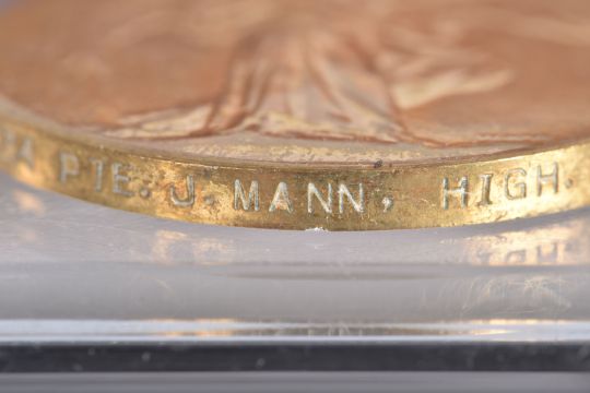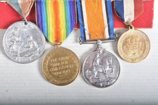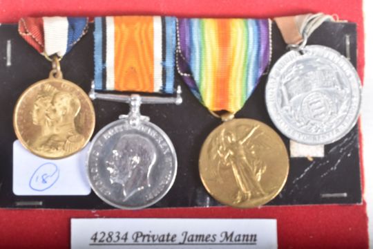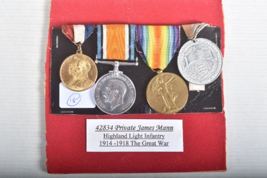 A WWI PAIR OF MEDALS AND BURGH OF PEEBLES PEACE MEDAL and Coronation medal, the four medals are named to 42834 Private James Mann who served with the Highland Light Infantry, Customers must satisfy themselves prior to sale in regards to conditions and authenticity, viewing is advised, condition reports are available on request