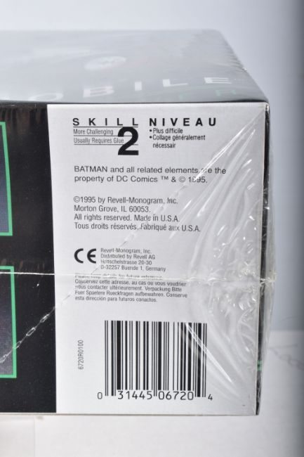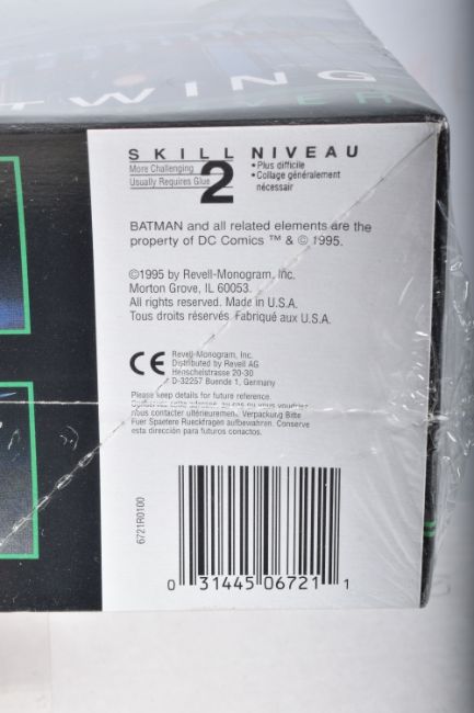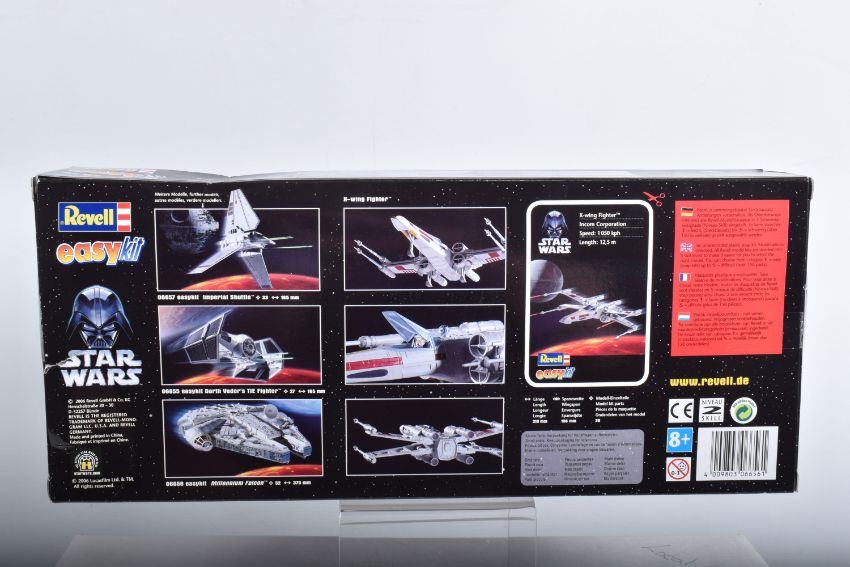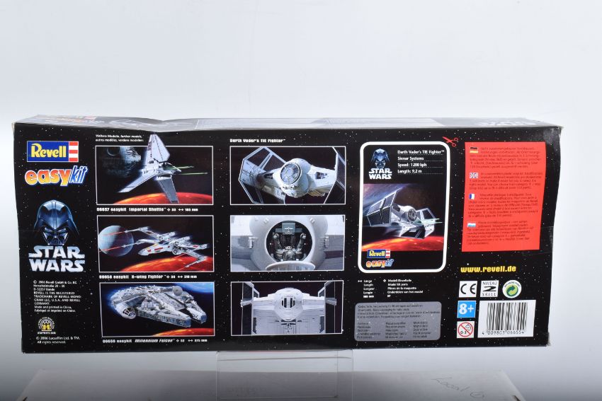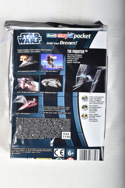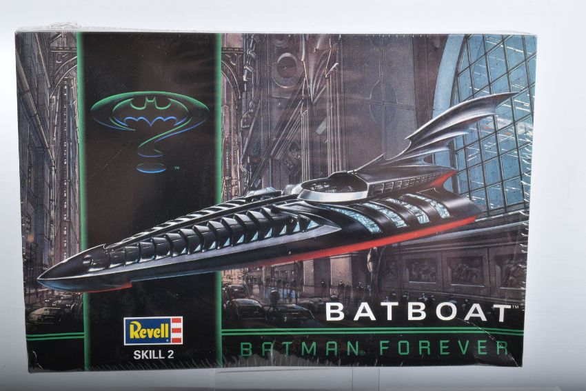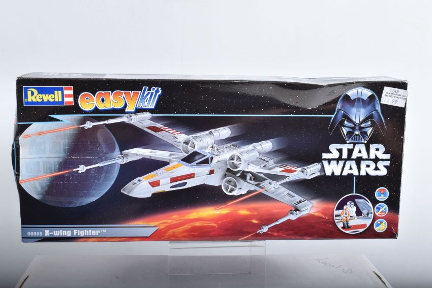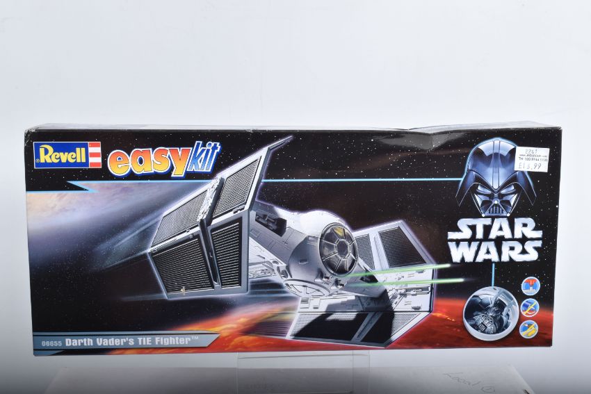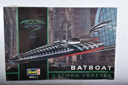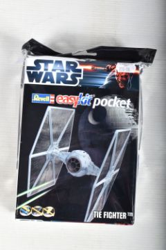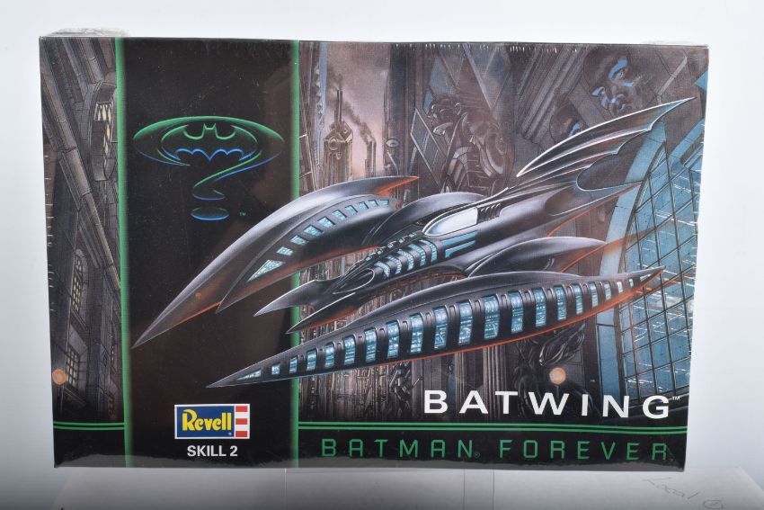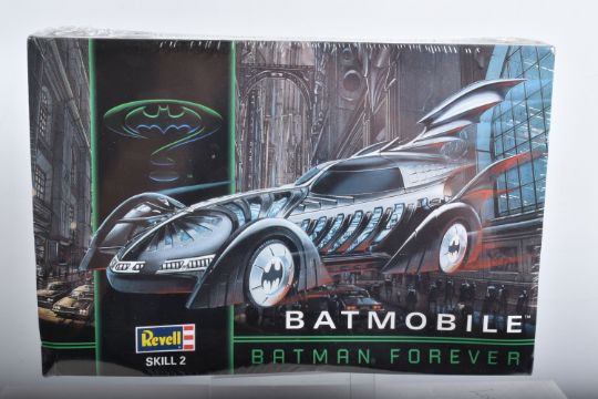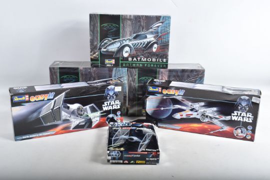SIX BOXED REVELL STAR WARS AND BATMAN FOREVER KITS, to include a 1995 unopened plastic wrapped Skill 2 Batmobile, Batman Forever, 1:25 scale, kit no. 6720, a 1995 unopened plastic wrapped Skill 2 Batboat, Batman Forever, 1:25 scale, kit no. 6722, a 1995 unopened plastic wrapped Skill 2 Batwing, Batman Forever, 1:25 scale, kit no. 6721, a 2006 Skill 2 Easykit Star Wars X-Wing Fighter, kit no. 06656, a 2006 Skill 2 Easykit Star Wars Darth Vader's Tie Fighter, kit no. 6655, and an unopened 2012 Easykit Pocket Tie Fighter 1:10 scale, kit no. 06734, all are in like new condition, the unsealed boxes have not been checked for completeness, cardboard box conditions are good with light wear and dust