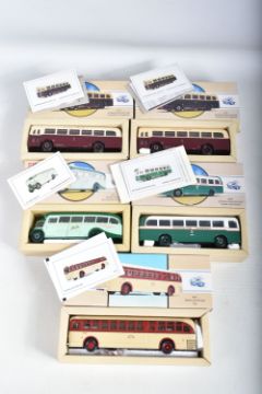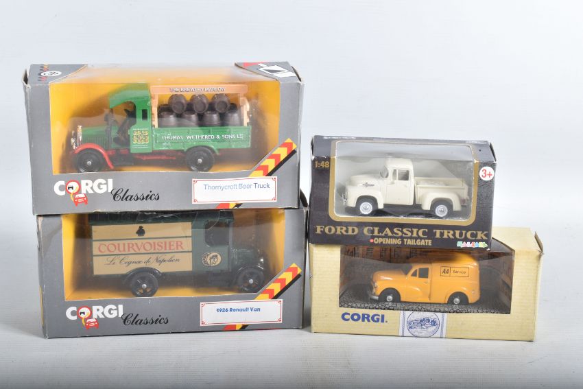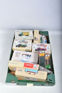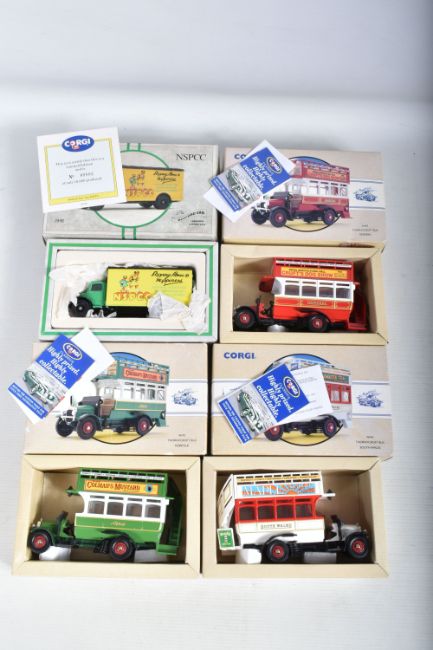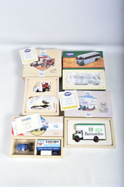 A TRAY OF BOXED DIECAST CORGI MODEL VEHICLES, some of these include a NSPCC The Bedford Van numbered 97123, included in box is a certificate numbered 09802 of 10,000, A Classic Commercials Barnardos van numbered 97087, includes certificate numbered 1967 of 4000, a Corgi Classics Vintage buses USA General Motors 4506 DSR numbered 98603, included in box is an information leaflet and certificate numbered 2434 of 5000, a Corgi Classics Public Transport Thornycroft Bus Norfolk numbered 96992, included in box is an information booklet, a Corgi Classics Morris 1000 Van AA service model numbered 96849, a Classics 1926 Renault Van numbered 917, a Classics Thornycroft Beer Truck numbered C867, all appear to be in good condition, however contents has not been checked for their completion, housed inside their boxes, boxes in varying conditions some with breaks in the plastic, boxes have wear to sharp edges and corners, light dust to all
