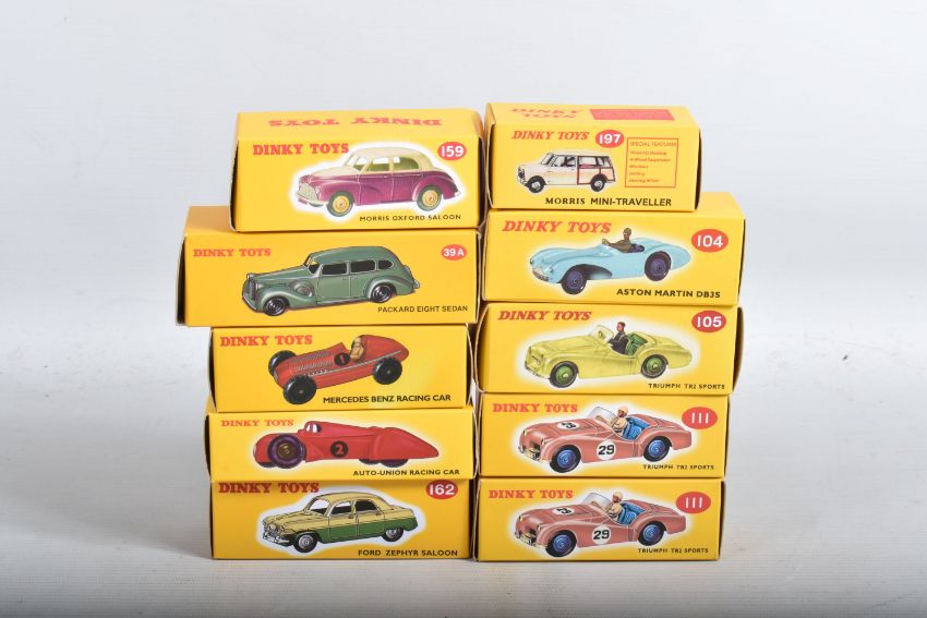 A QUANTITY OF BOXED ATLAS EDITION REPRODUCTION DINKY TOYS CAR MODELS, Mercedes-Benz Racing Car, No.23C, Auto-Union Racing Car, No.23D, Packard Eight Sedan, No.39A, Aston Martin DB3S, No.104, Triumph TR2 Sports (Touring), No.105, 2 x Triumph TR2 Sports (Competition), No.111, Morris Oxford saloon, No.159, Ford Zephyr saloon, No.162 and Morris Mini Traveller, No.197, all in very good condition, look to have hardly, if ever, been removed from boxes, majority still wrapped in tissue paper, boxes are all complete but some have minor damage, fading, marking and wear (10)