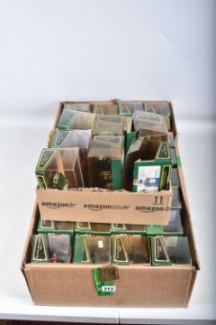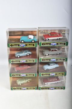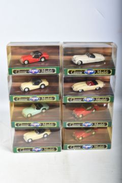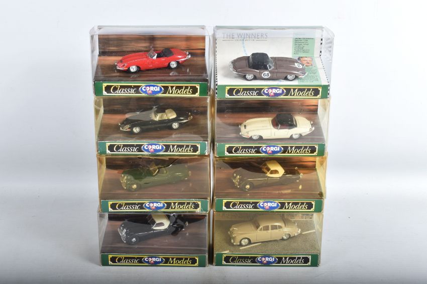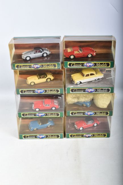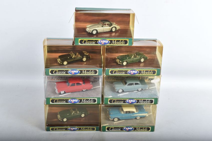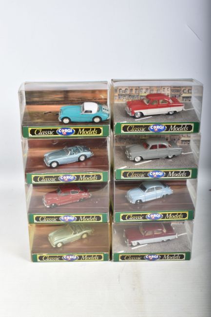 A QUANTITY OF BOXED CORGI CLASSIC MODEL CARS, to include a Jaguar E Type Open Top, model no. 96060, a Porsche Open Top, model no. 96360, a Ferrari 250 GTO, model no. D740, a Triumph TR3A Soft Top, model no. 96300, an Austin Healey Soft Top, model no. 96240, a Saab 96, model no. D711, a Ford Zephyr Saloon, model no. D710, a Ford Zodiac Saloon, model no. D709, a Jaguar XL120 Soft Top, model no. 96060, a MGA Soft Top, model no. D733, to name a few of the 39 models, the models appear to be in good condition however the contents have not been checked for their completion, the plastic casing on the boxes show wear and cracks, some of the cars are loose, the cardboard boxes appear to be in good condition, some with some small creases, light wear to sharp edges and corners, some yellowing to plastic casing (2 boxes)