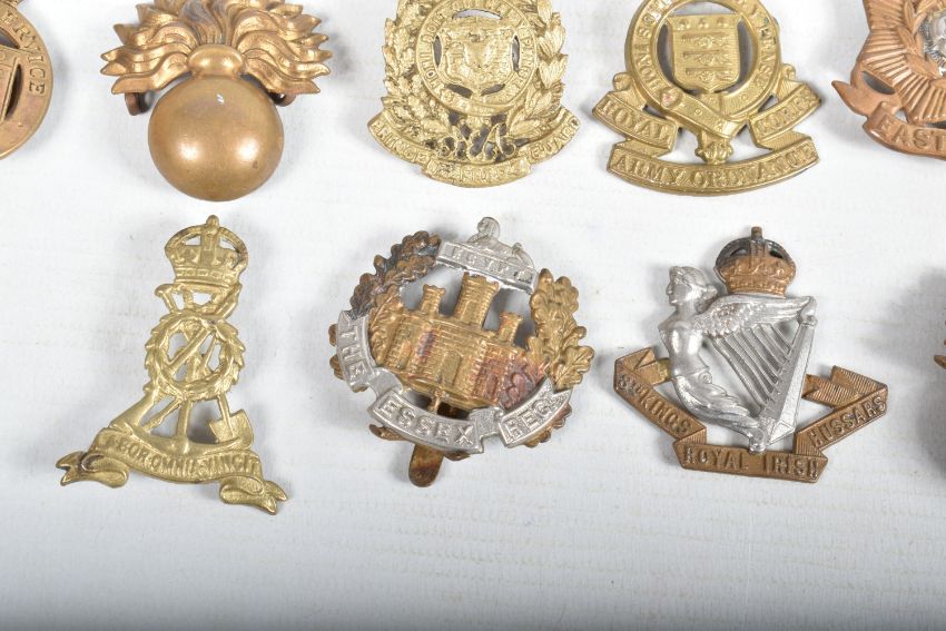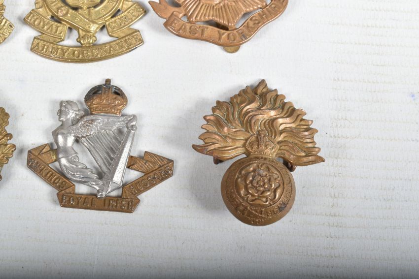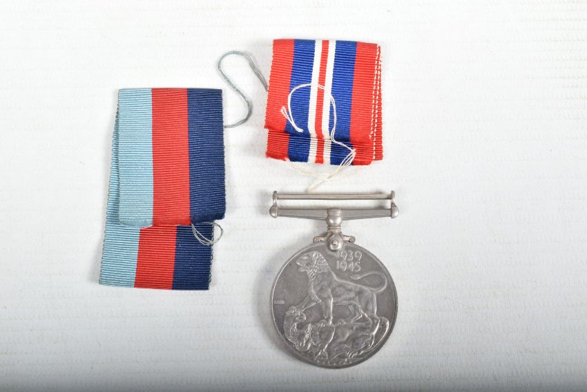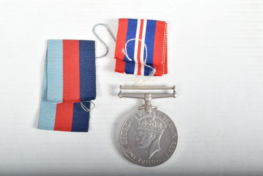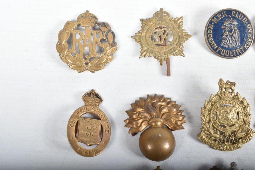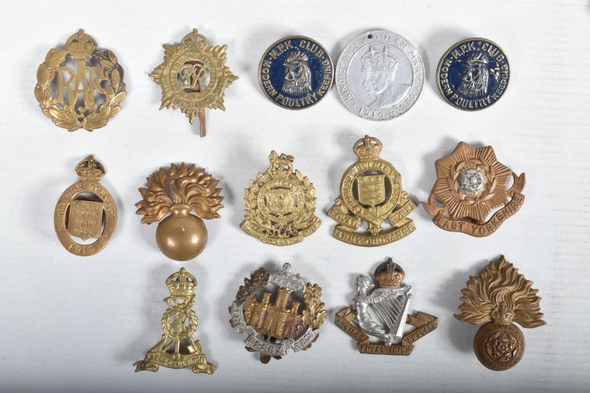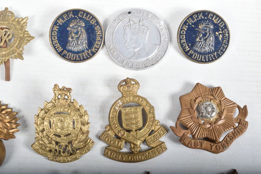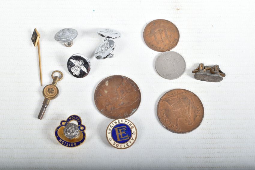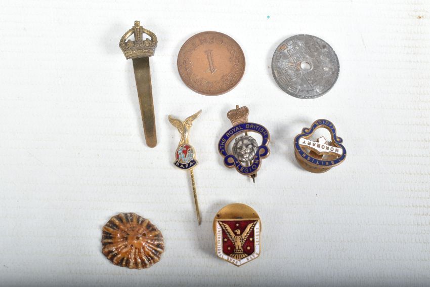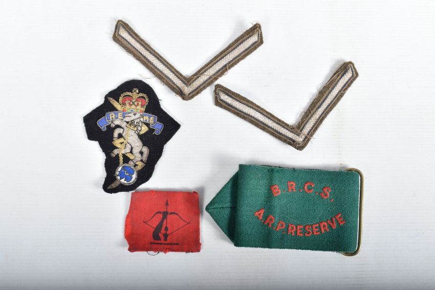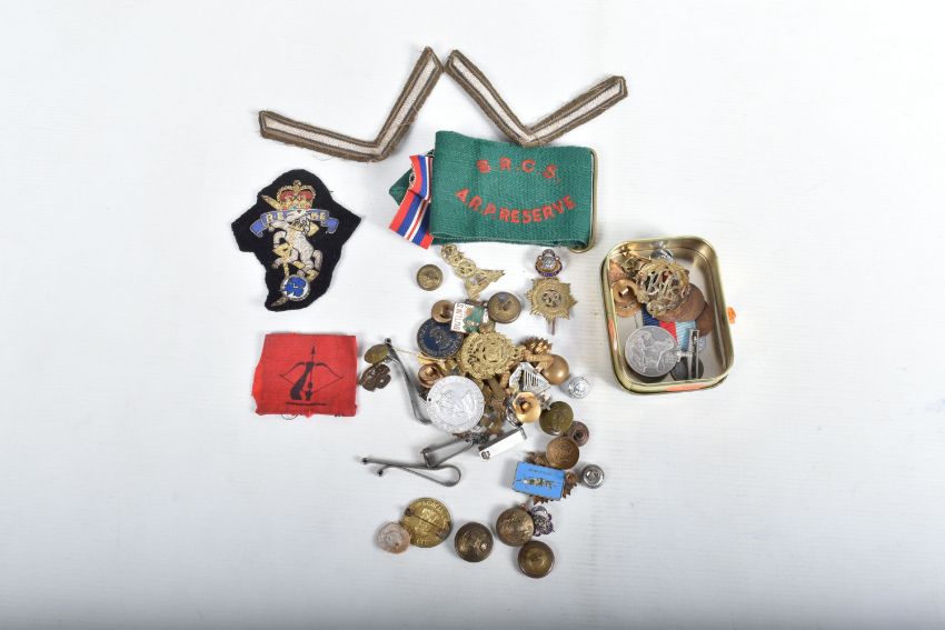 A WWII MEDAL AND A SMALL COLLECTION OF CAP BADGES, coins, pin badges and an ARP armband, the cap badges include East Yorkshire, Essex, RAF, the other badges include Girl Guides, Butlins, Radio Society of Great Britain, also included is a WWI on War Service badge, a 1939 4S medal, cloth rank stripes and a British Red Cross Society ARP Reserves armband, the coins include ones from GB and Malta