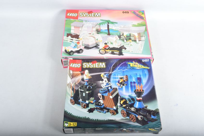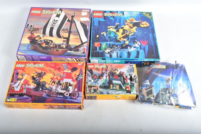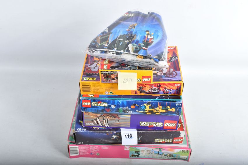 SIX BOXED UNBUILT LEGO SYSTEM MODELS AND ONE EMPTY BOX, the first a 6045 Lego Castle, 6047 Lego Castle, 6175 Aquanauts Crystal Explorer Sub, 6268 Renegade Runner, all appear to have been previously opened, contents have not been checked for completion but appear in good condition, parts have been re-bagged into plastic bags, all instruction books appear to be present, a 6497 Time Cruisers this has instructions in box and empty box is for 6419 Rolling Acres Ranch, boxes are in okay condition, some have wear to sharp edges and corners and some with light crushing to corners, some with Sellotape too end panels