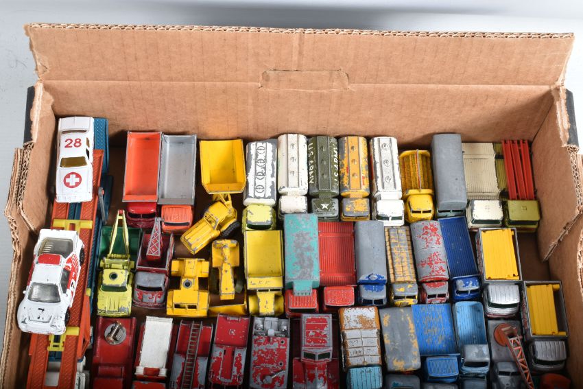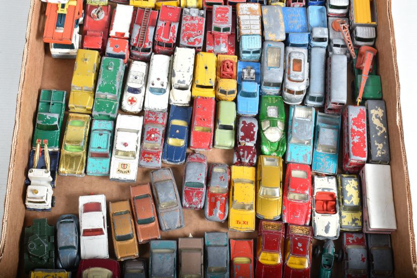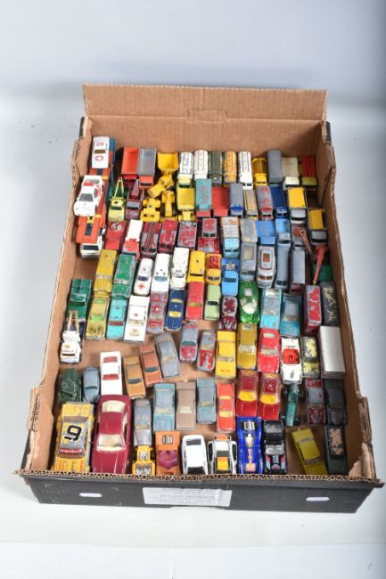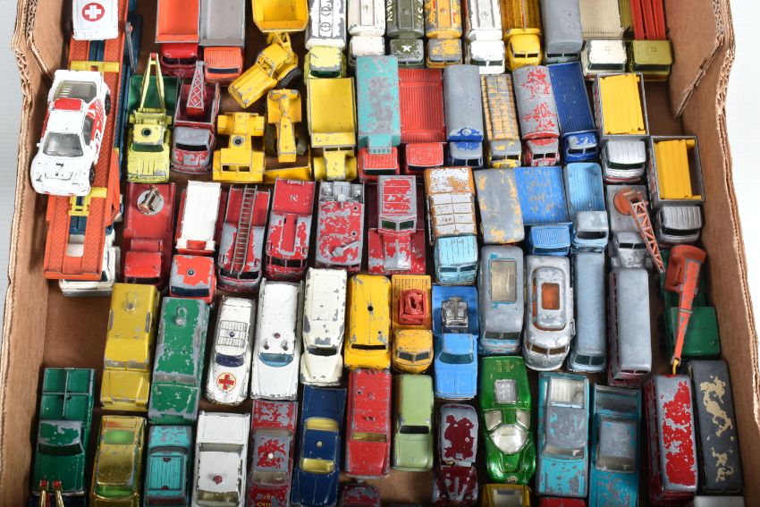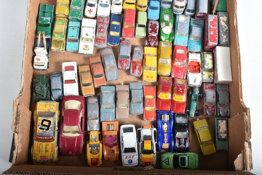 A QUANTITY OF UNBOXED AND ASSORTED PLAYWORN DIECAST VEHICLES, majority are Matchbox 1 - 75 series or Husky models, but does include Corgi Rockets Aston-Martin DB-6, No.D901, gold body and Ford H Series Holmes Wrecker Truck, No.D933, white cab, with both hooks, both missing key, Matchbox include Vauxhall Cresta, No.22, gold body and copper body,