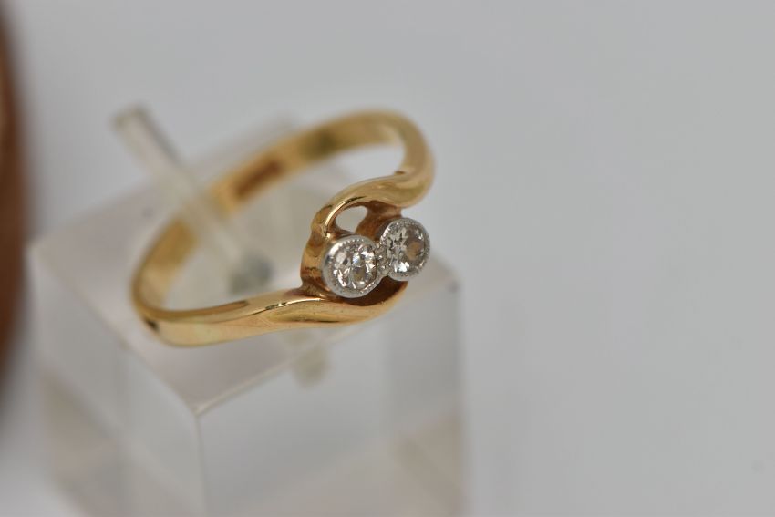 A DIAMOND CROSSOVER RING, designed as two old cut diamonds in millegrain setting to the crossover band, estimated total diamond weight 0.20ct, stamped 18ct, ring size M, approximate weight 3.1 grams (condition report: light to moderate general wear, diamonds bright and lively)