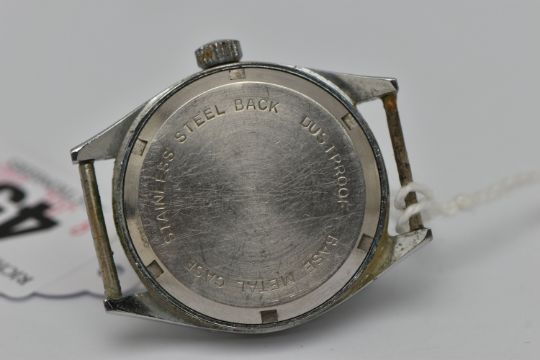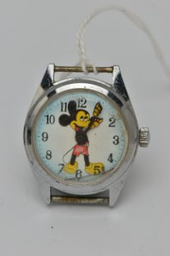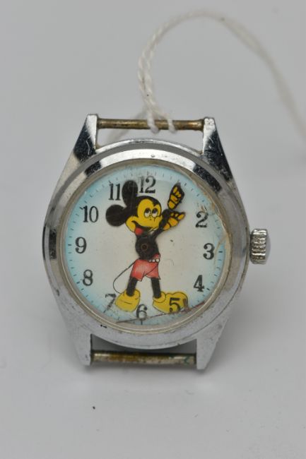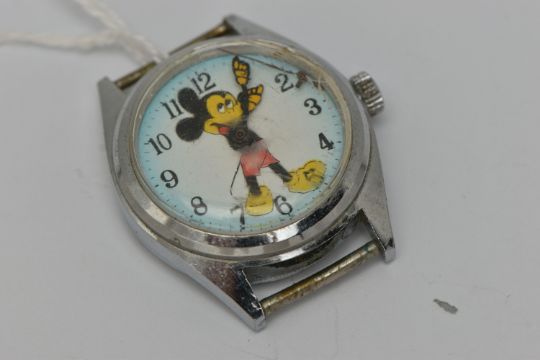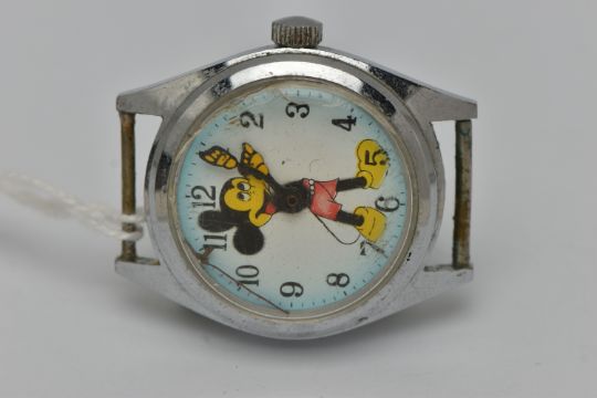 A CHILDS MICKEY MOUSE WATCH HEAD, manual wind stainless steel watch, round blue dial depicting Mickey Mouse with his hands being the hour and minutes, seconds red hand free from mount, Arabic numerals, approximate case width 31.9mm (condition report: not currently working, crack to the glass, one hand is free from mount and loose inside the case, we cannot guarantee the working order of any watch)