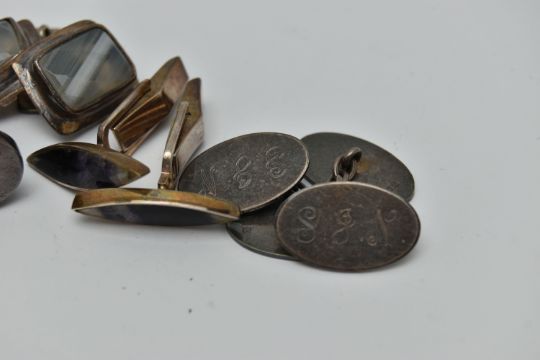 A SELECTION OF CUFFLINKS, to include a pair of silver oval chain link cufflinks, hallmarked Birmingham, a pair of white metal Blue John marquise form cufflinks, with toggle fittings, stamped 925, a pair of white metal oval cufflinks with thistle detail, toggle fittings, stamped 925, a pair of white metal banded agate chain link cufflinks, stamped 925, and a pair of white metal 'Montblanc' rectangular cufflinks with toggle fittings