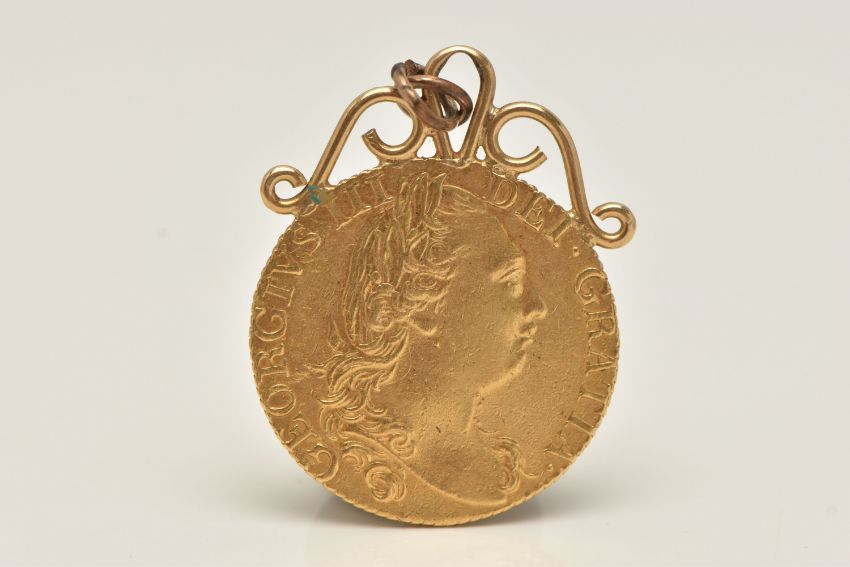 A GEORGE III GOLD GUINEA 4th HEAD MOUNTED COIN, dated 1785, soldered with a yellow metal scrolling surmount, fitted with a jump ring for suspension, approximate gross weight 9.5 grams (condition report: general light wear, some wearing to the coin)