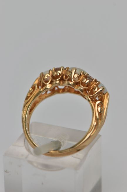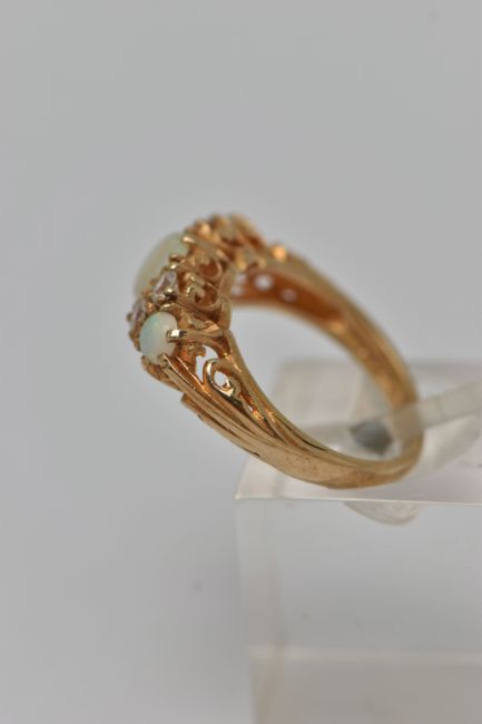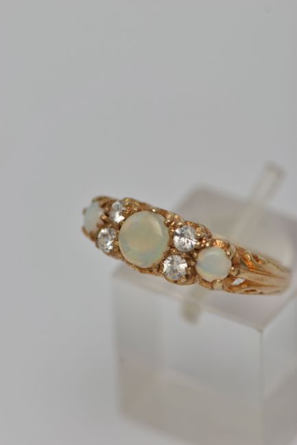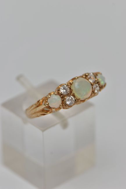 A 9CT GOLD GEM SET RING, three round opals, prong set in yellow gold, accented with one circular cut paste stone, the additional circular cut stones assessed as spinel, hallmarked 9ct London, approximate gross weight K 1/2, approximate gross weight 3.2 grams (condition report: general moderate wear, overall condition good)