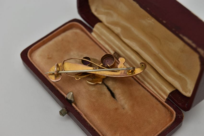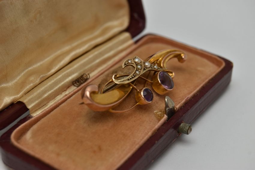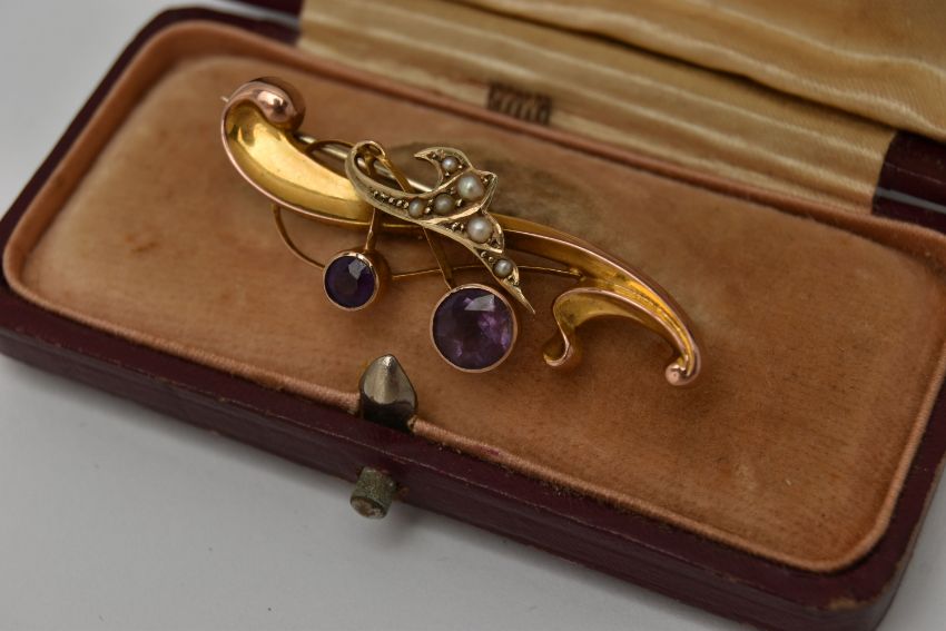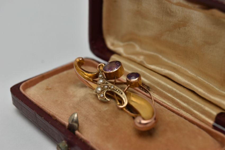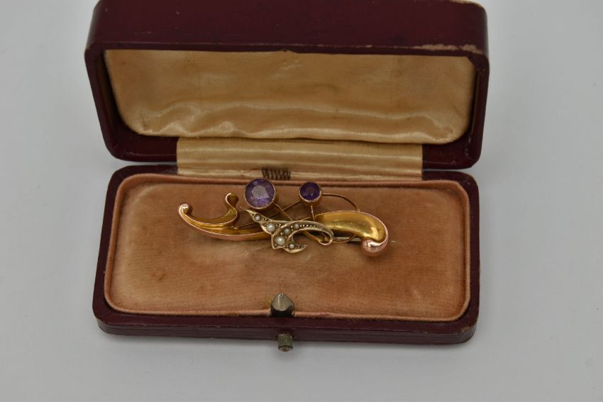 AN EARLY 20TH CENTURY BROOCH, a scrolling yellow gold brooch set with two circular cut amethysts and split pearls, approximate length 41mm, fitted with a base metal pin, hallmarked 9ct Brimingham, approximate gross weight 2.5 grams, together with the original box, (condition report: general moderate wear, overall condition good)