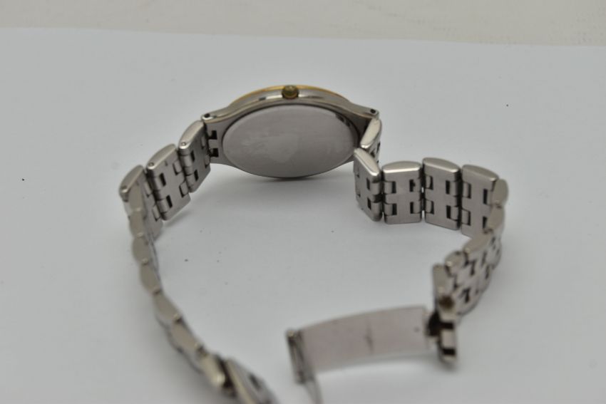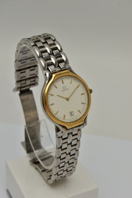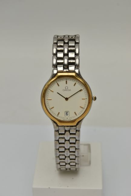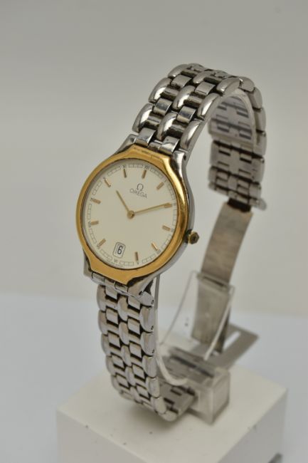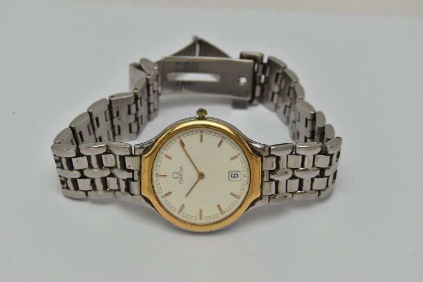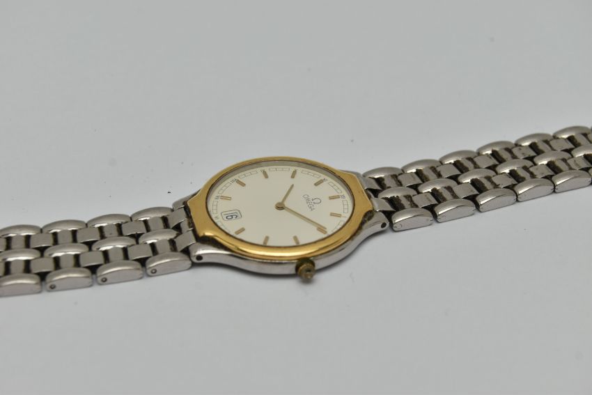 A GENTS 'OMEGA' QUARTZ WRISTWATCH, round white dial signed 'Omega', baton markers, date aperture at the six o'clock position, gold tone bezel with a stainless steel case back signed 'Omega', inside case back signed 'Omega Watch Co, 196 0316, 396 1016, movement signed 'Omega 1436, 255441, approximate case width 31.7mm, fitted with a stainless steel bracelet with folding clasp (clasp requires attention), signed 'Omega 1449/432/2 (condition report: not currently working may require a new battery, would benefit from a gentle clean and polish, wear to the crown, clasp needs attention, we cannot guarantee the working order of any watch)