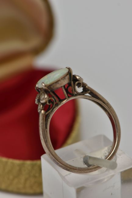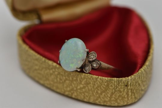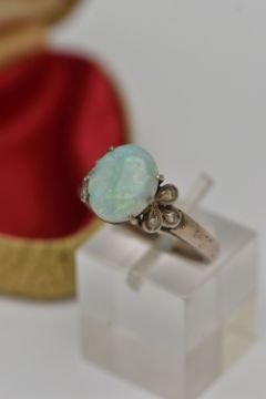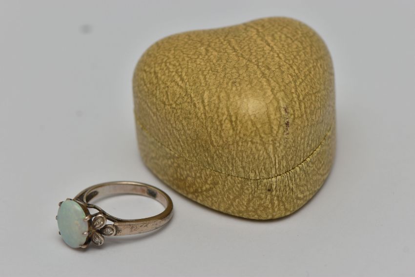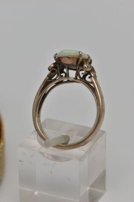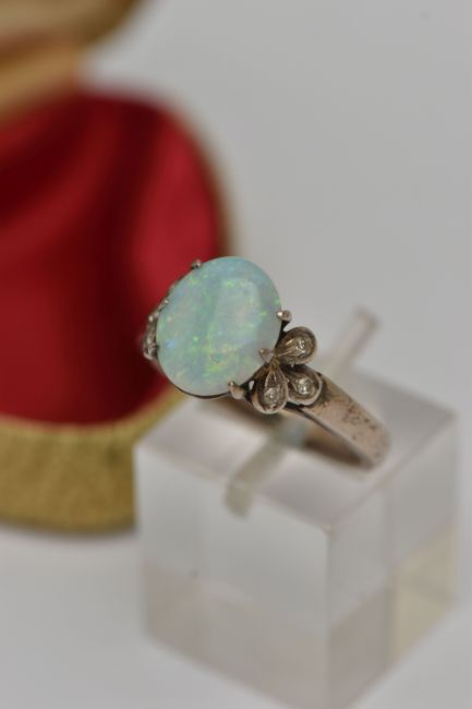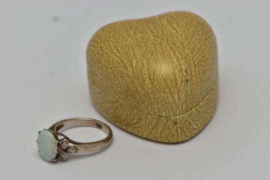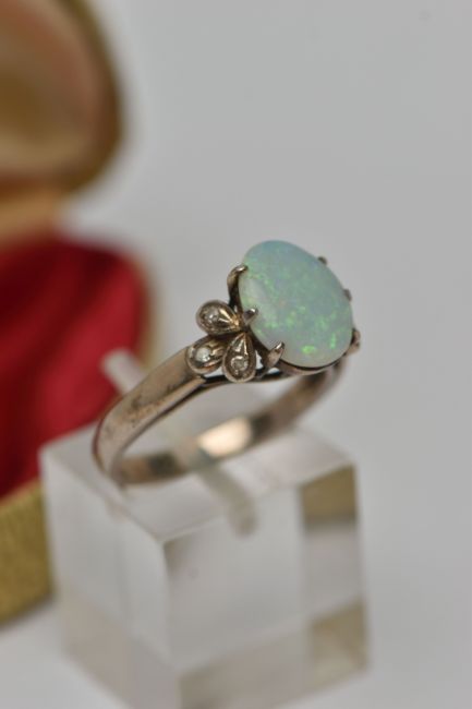 AN OPAL RING, an oval opal, approximate length 10.5mm, prong set in white metal, flanked with six single cut diamonds, scrolled detail to the gallery, stamped 14k, ring size O, approximate gross weight 3.4 grams (condition report: general moderate wear, stone slightly lose in setting requires attention)