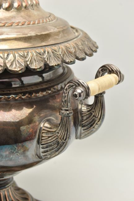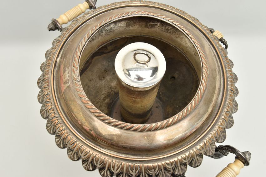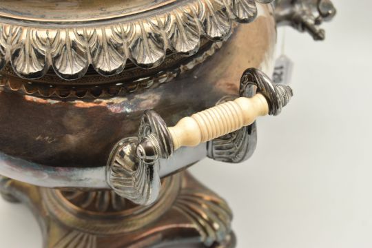 A LATE 19TH/EARLY 20TH CENTURY SILVER PLATED SAMOVAR/TEA URN, the squat baluster body, acanthus leaf rim, scroll handles, carved ivory insulators, embossed lid, acanthus leaf finial, raised on a square platform base with circular feet, with removable inner metal cylinder for heating, inner edge of lid stamped RL, approximate height 410mm (condition report: IMPORTANT NOTE, This lot contains elephant ivory material. Please be advised that several countries, including those in the EU and the USA, now prohibit the importation of ivory items unless under specific conditions. Accordingly, prospective buyers should familiarize themselves with the relevant customs regulations of their country and ensure they are able to import this item prior to bidding. This item has been registered as exempt from the UK Ivory Act 2018, on account of it being made before 1947 with less than 10% Ivory by volume. Ivory declaration submission reference: H2R67AE8, condition heavy tarnishing, you can see the copper showing through in quite a few of the raised areas, a dint to the back of the baukster body, a couple of smaller dints to the back, the lid has a dint to the edge of the embossed pattern, finial is slightly off centre)