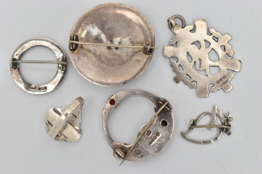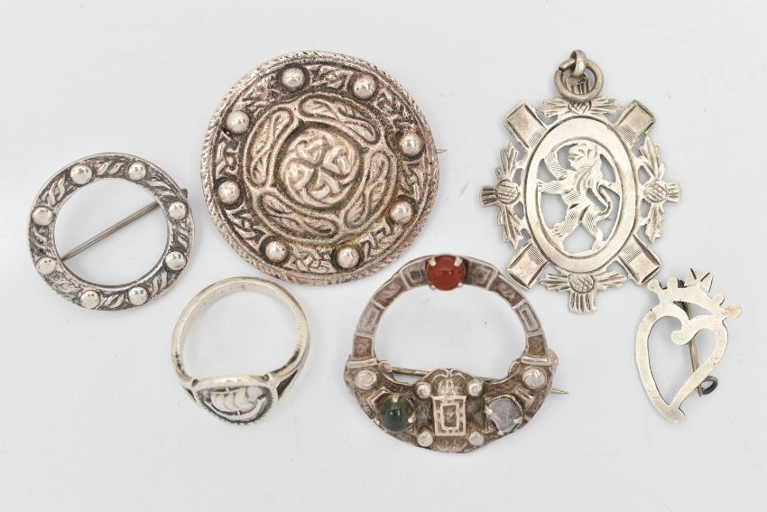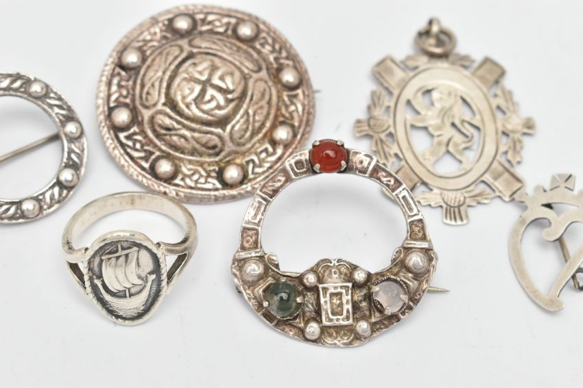 A SELECTION OF MAINLY SCOTTISH JEWELLERY, to include circular silver brooch, hallmark for Robert Allison, Edinburgh 1957, two further Robert Allison brooches, a ring with ship to front, a lion pendant etc, stamped sterling silver, remaining with silver hallmarks, approximate total weight 40 grams
