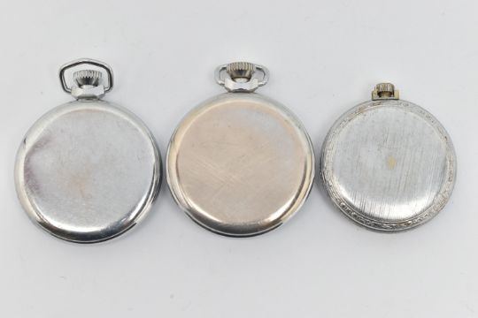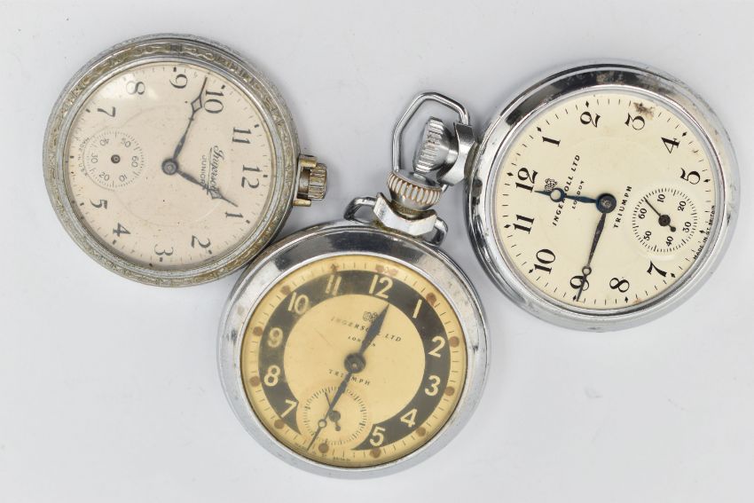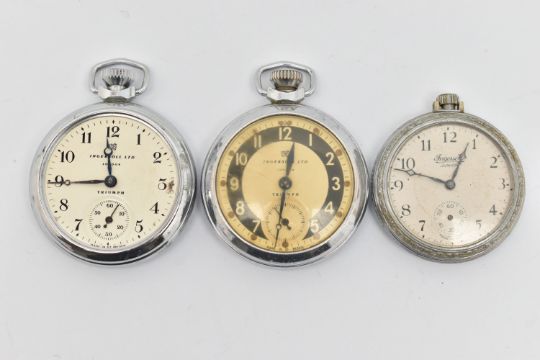 THREE 'INGERSOLL' POCKET WATCHES, all manual wind open face pocket watches, to include two Ingersoll Triumphs, and an Ingersoll junior, all with round Arabic numeral dials and base metal cases (condition report: will require some attention, missing hands, glass cover, not tested for working order, we cannot guarantee the working condition of any watch)