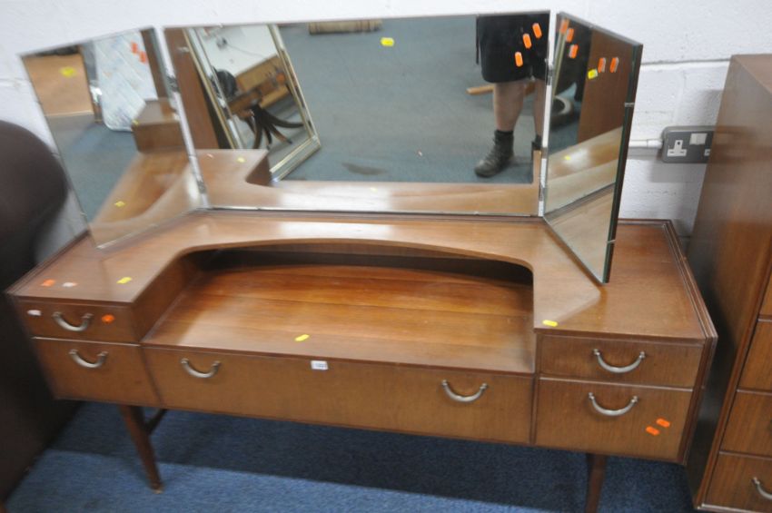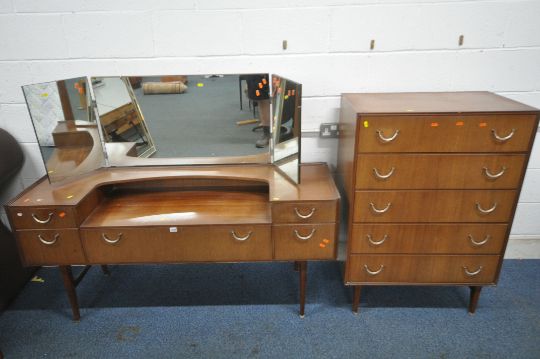 A MID CENTURY TEAK TWO PIECE BEDROOM SUITE, comprising a dressing table, fitted with a triple dressing mirror and five assorted drawers, width 153cm x depth 46cm x height 122cm, along with a chest of five drawers (condition report: marks, scuffs, other signs of wear and usage) (2)