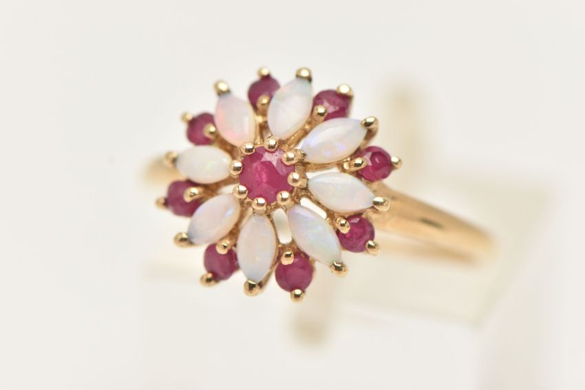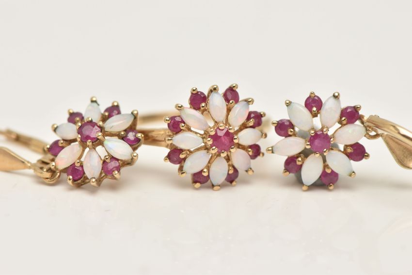 A 9CT GOLD RUBY AND OPAL RING WITH MATCHING EARRINGS, the ring designed as a circular cluster set with marquise cut opal cabochons, and circular cut rubies, to a polished band, hallmarked 9ct Birmingham, ring size L 1/3, together with a pair of matching drop earrings, with fish hook fittings, stamped 375 and 9k, drop length 28mm, approximate gross weight 4.3 grams (condition report: general light wear, overall condition good)