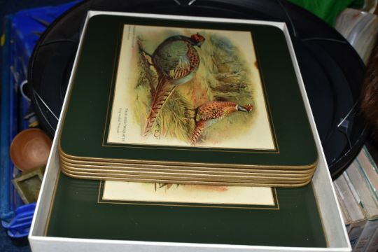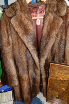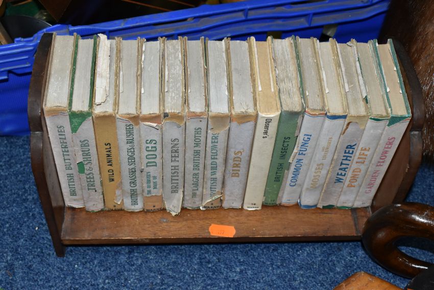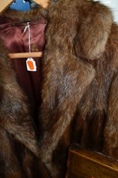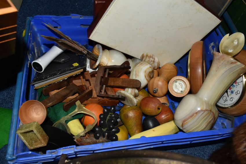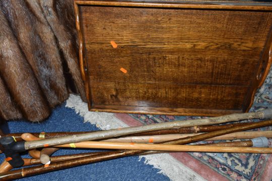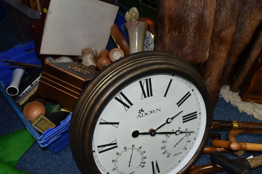 TWO BOXES AND LOOSE MISCELLANEOUS SUNDRIES to include a box of empty frames, three wall clocks, an assortment of artificial fruit, three onyx table vases and an inlaid onyx trinket box, five walking sticks, a vintage ladies' fur coat (approximate size 10-12) (wear around the pockets and evidence of aging on the collar), sixteen pocket Observer Books on a shelf comprising titles including Birds, British Wild Flowers, The Larger British Moths, Wild Animals, Garden Flowers, etc (2 boxes and loose) (s.d)