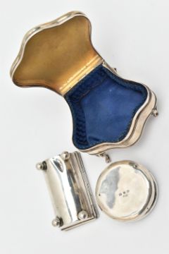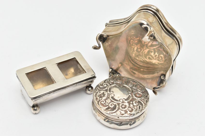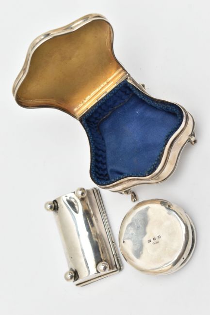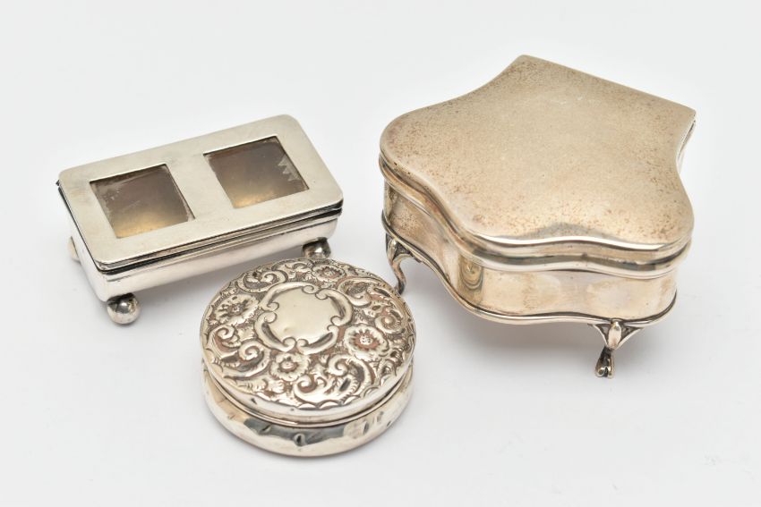 THREE ITEMS OF SILVER, to include a polished trinket box raised on four cabriole legs, blue silk fabric interior, hallmarked 'James Deakin & Sons' Birmingham 1920, a small round embossed pill box with vacant cartouche, hallmarked 'William Vale & Sons' Birmingham 1899, together with a polished stamp holder on four ball feet with hinged cover, gilt interior, hallmarked 'Levi & Salaman' Birmingham 1900, approximate gross weight 129.0 grams, 4.14 ozt (condition report: general wear in keeping with age, dinks and dents to the pill box and stamp holder, tarnishing in places)