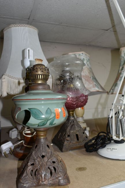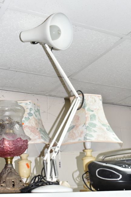 A GROUP OF LAMPS AND SUNDRY ITEMS, to include a white Model 90 Anglepoise lamp, two glass reservoir oil lamps (one with broken reservoir), a wooden based table lamp, three other table lamps including a pair, a Roberts Classic 928 radio, and a CD player (9) (Condition Report: generally appear ok, untested, sd and as stated)