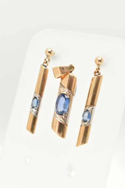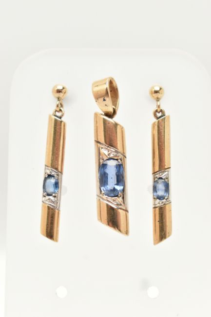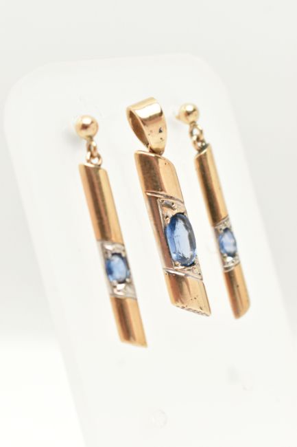 A 9CT GOLD SAPPHIRE PENDANT AND MATCHING EARRINGS, polished bar pendant, set with an oval cut blue sapphire, four claw set, pendant fitted with a tapered bail, hallmarked 9ct Birmingham, length including bail 30mm, together with a pair of matching drop earrings, fitted with posts for pierced ears and slide on backs, one earring hallmarked 9ct Birmingham, drop length 31mm, approximate gross weight excluding earring backs 6.0 grams (condition report: general light wear, sapphires possibly treated, one post is bent at the end)