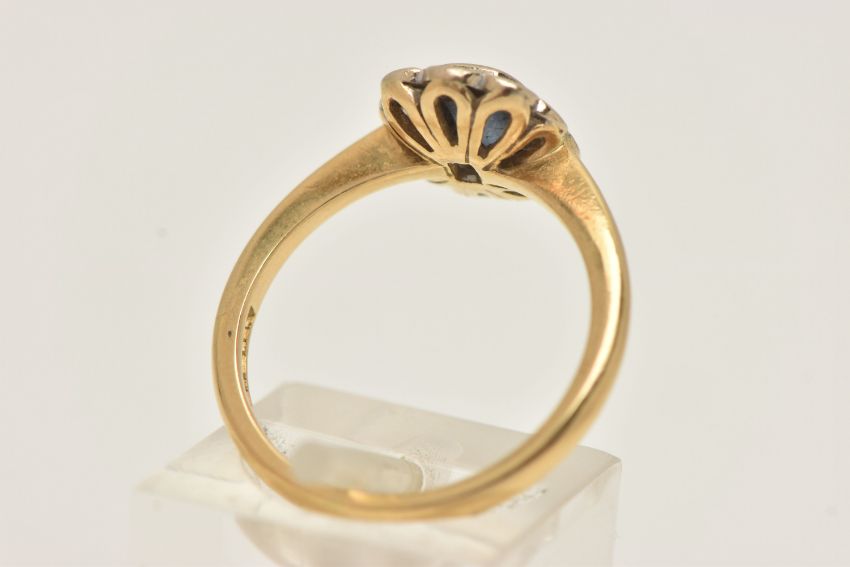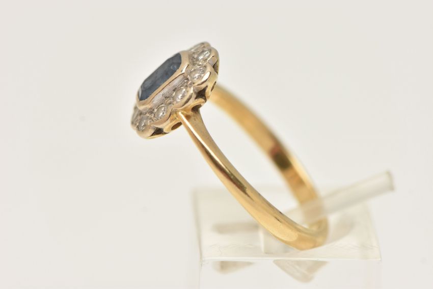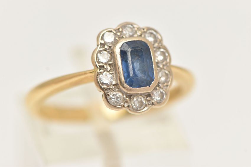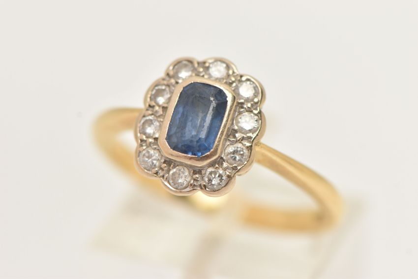 AN 18CT GOLD SAPPHIRE AND DIAMOND CLUSTER RING, centering on an emerald cut blue sapphire, collet setting, in a surround of round brilliant cut diamonds, estimated total diamond weight 0.20cts, collet setting, pinched shoulders and polished band, hallmarked 18ct Birmingham 1996, ring size O, approximate gross weight 4.3 grams (condition report: abrasion to the facet edges of the sapphire, all stones secure, would benefit from a gentle clean and polish)