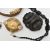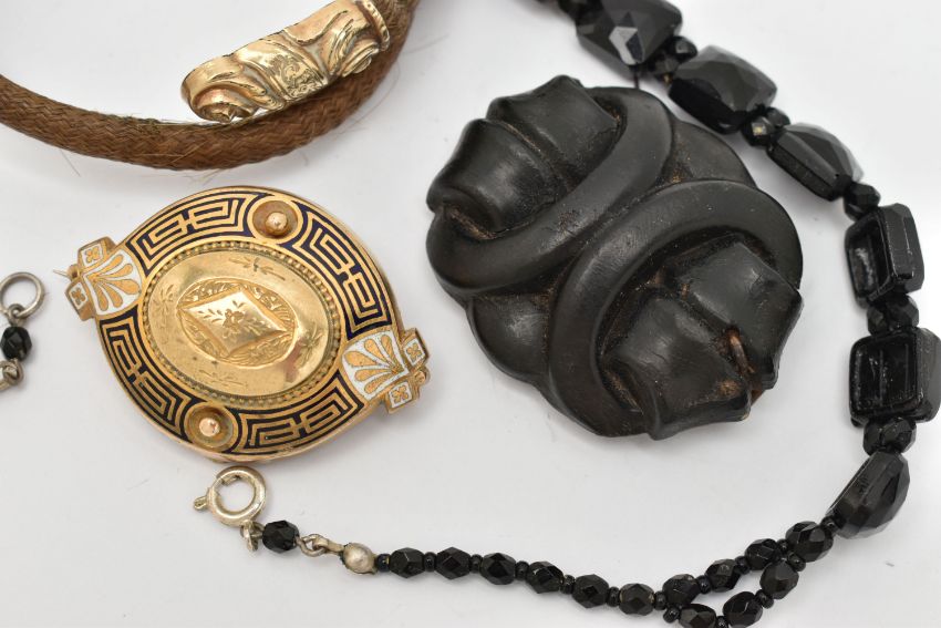 FOUR ITEMS OF MAINLY MOUNRING JEWELLERY, to include a woven hair bracelet with embossed terminals, a carved jet brooch, an oval brooch with black and white enamel detail and vacant panel to the reverse, and a French jet necklace, approximate lengths 43mm to 370mm