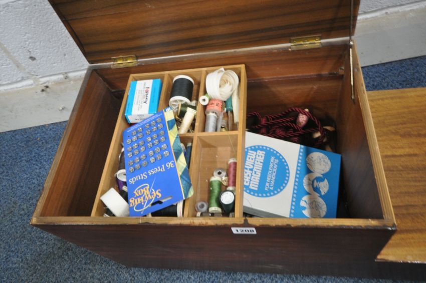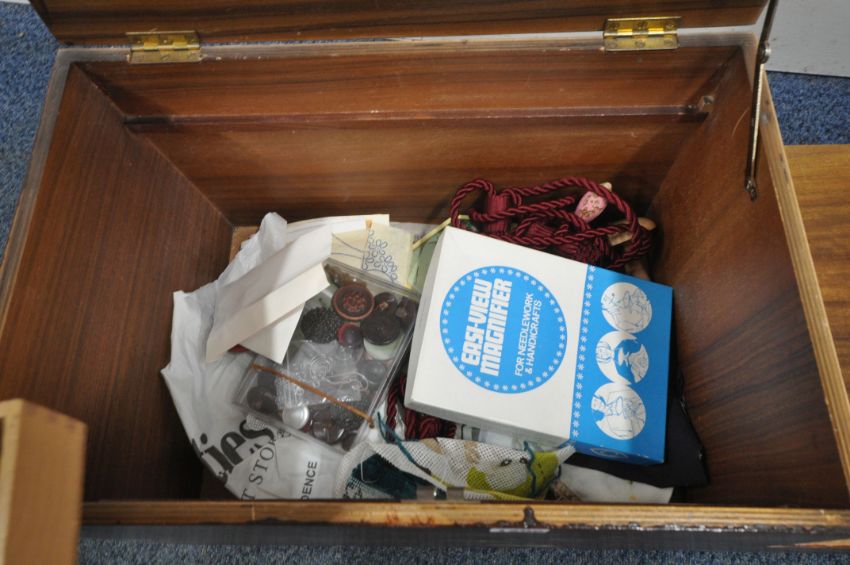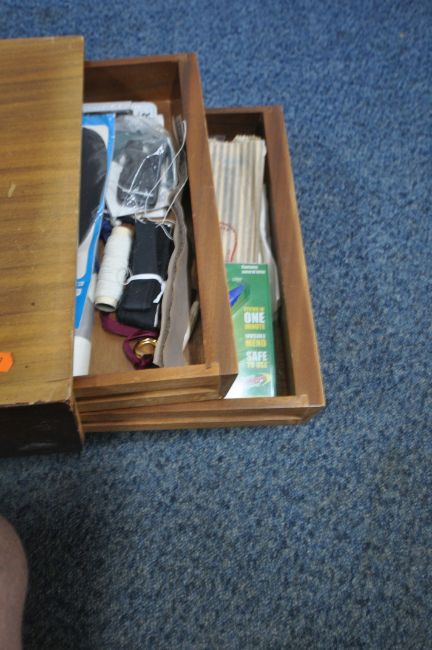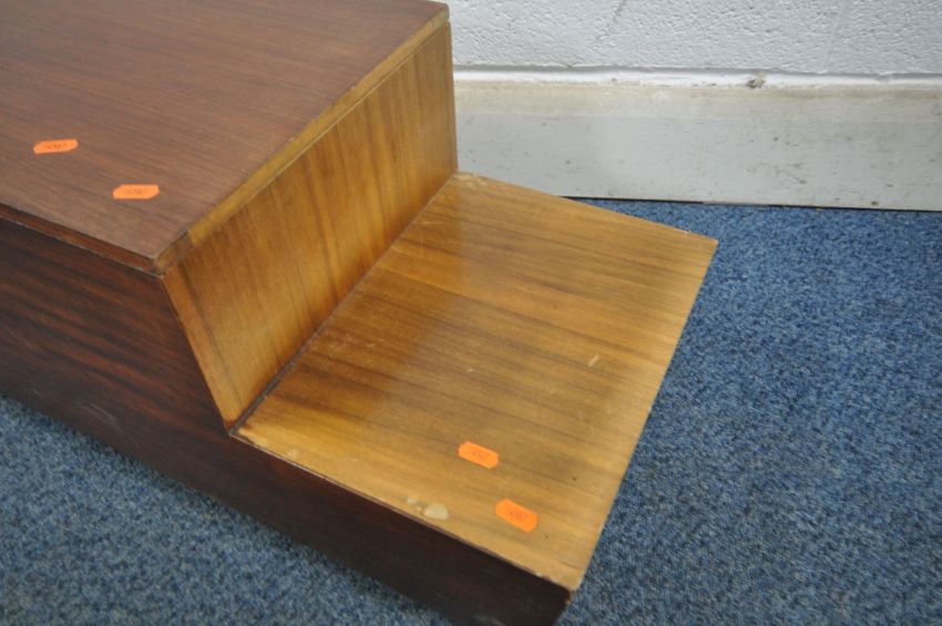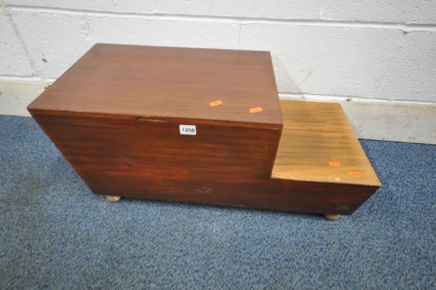 A MID CENTURY TEAK STEPPED SEWING BOX, with a hinged lid, two drawers and contents, raised on castors, width 74cm x depth 33cm x height 33cm (condition report: marks, scuffs, some discolouration, over stained, other signs of wear and usage)
