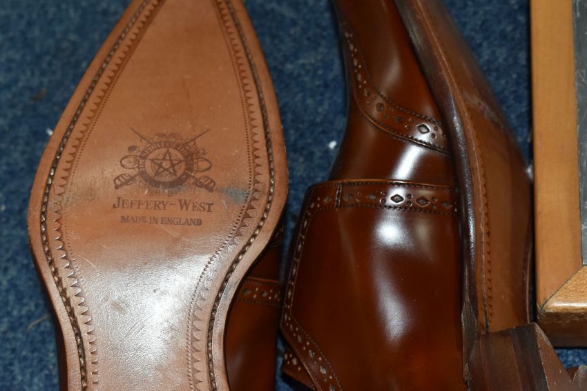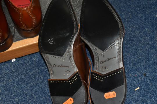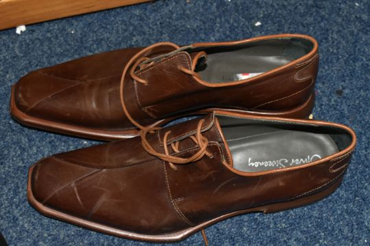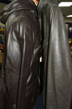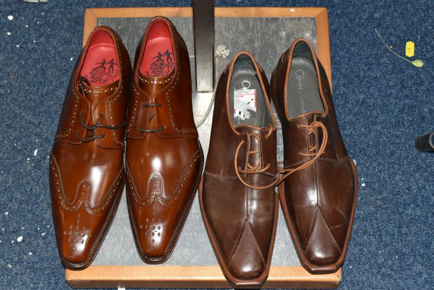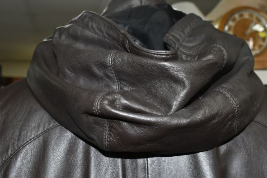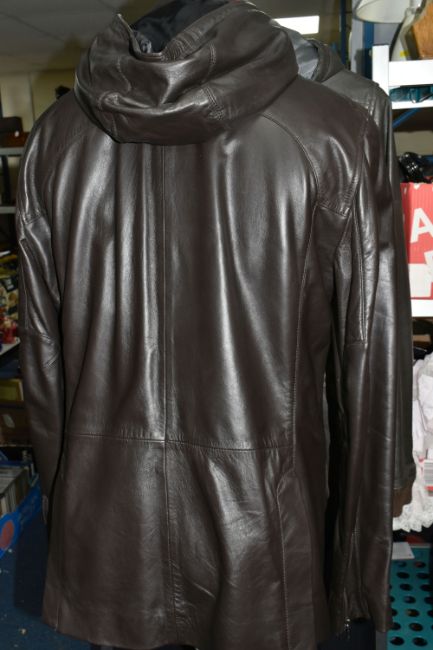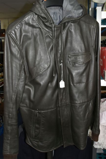 TWO ARMANI EXCHANGE LEATHER JACKETS, comprising a brown leather Armani Exchange jacket with detachable hood, size L and an olive coloured Armani Exchange hooded leather jacket, size M, together with two pairs of brown leather shoes, comprising a light brown pair of Jeffery West lace up 'Brogues', size 41/42, and a pair of brown leather lace up shoes by Oliver Sweeney, UK size 7.5 (4) (Condition Report: the olive green jacket has a small stain in the hood lining and a few light scratches/signs of light use, the brown jacket has had very little use, the brogue shoes appear to have had very light use, no visible damage) PLEASE NOTE MANNEQUINS ARE NOT INCLUDED - DISPLAY PURPOSE ONLY.