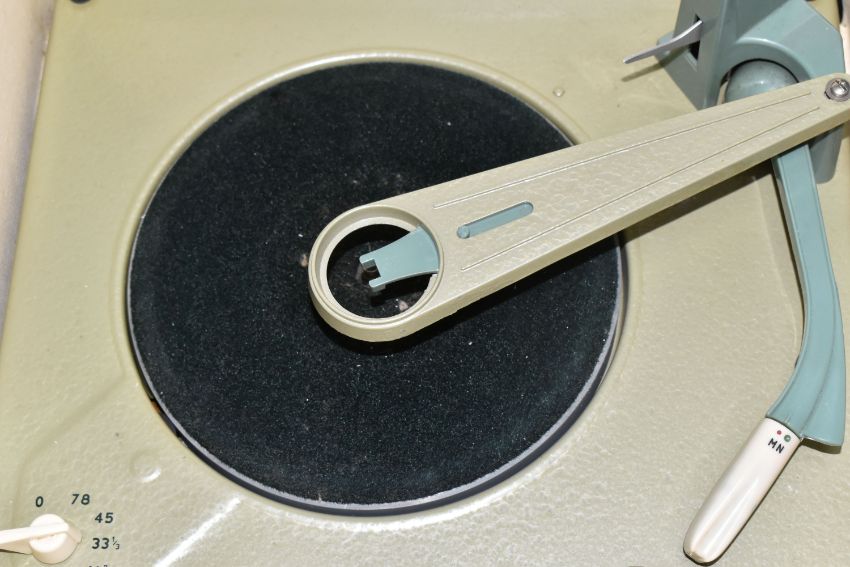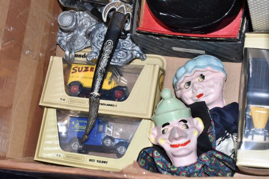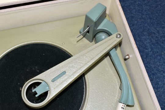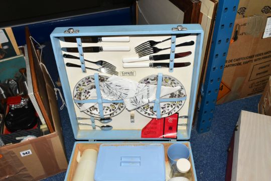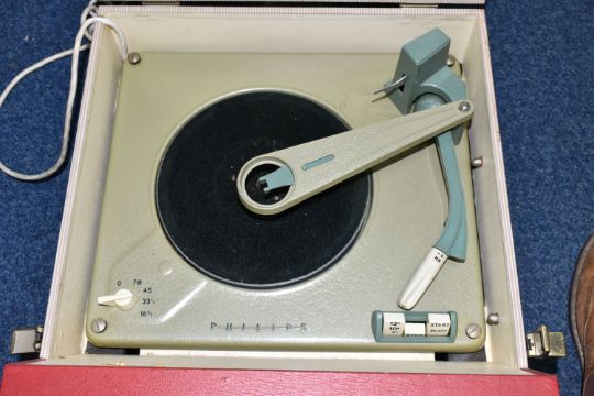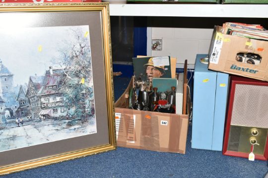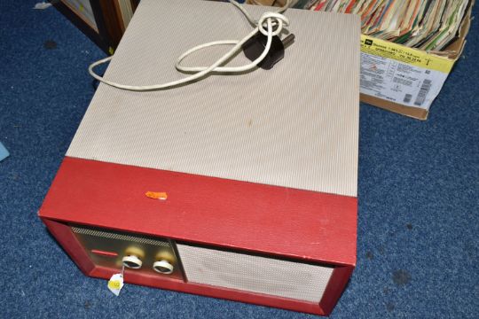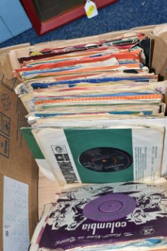 TWO BOXES AND LOOSE RECORDS, RECORD PLAYER, PICNIC SET, METAL WARE AND MISCELLANEOUS ITEMS, to include approximately ninety vinyl singles by artists including The Beatles: Please, Please Me 45-R 4983, Get Back R5777, and Let It Be R5833, The Rolling Stones Honky Tonk Women F.12952, T Rex: Ride a White Swan BUG-1, Elvis Presley: The Wonder of You RCA 1974, The Everley Brothers, The Monkees, Simon & Garfunkel: Bridge Over Troubled Water S4790, etc, a Philips Stella portable record player, a vintage GW Scott & Sons Ltd 'Coracle' cased picnic set for four people, a signed Bing Crosby programme, a cast iron circular sign marked 'HT Fire Brigade', Old Hall coffee ware, etc (2 boxes + loose) (sd, untested)