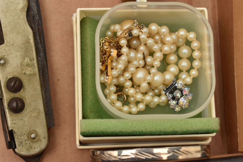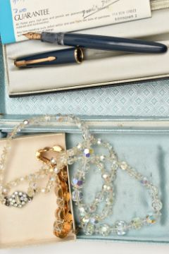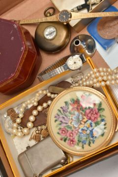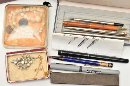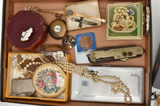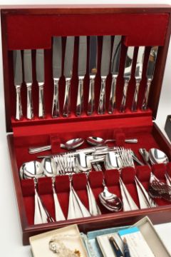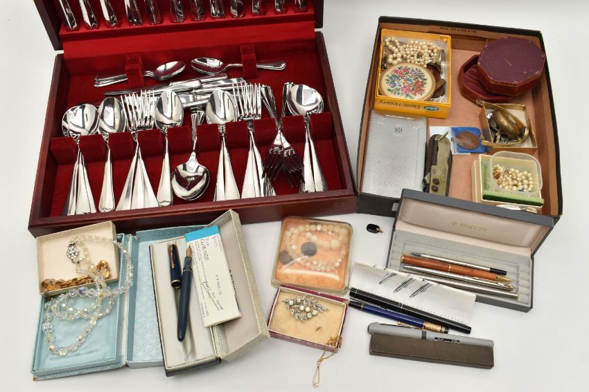 A WOODEN CANTEEN AND OTHER ASSORTED ITEMS, six person place setting of polished stainless steel cutlery, with six extra 'Arthur Price of England' stainless steel tea knives, a boxed 'Parker' fountain pen fitted with a 14k nib, other pens and propelling pencils, a base metal compass including a collapsable cup, a multi tool pocket knife, cultured pearl necklaces, brooches, ladies fashion wristwatches, medallion, small octagonal jewellery box etc