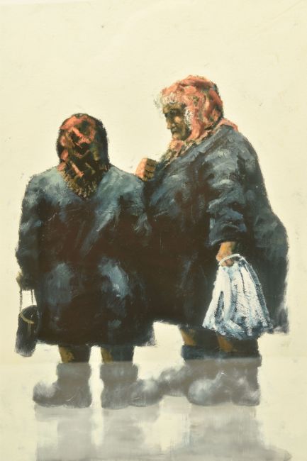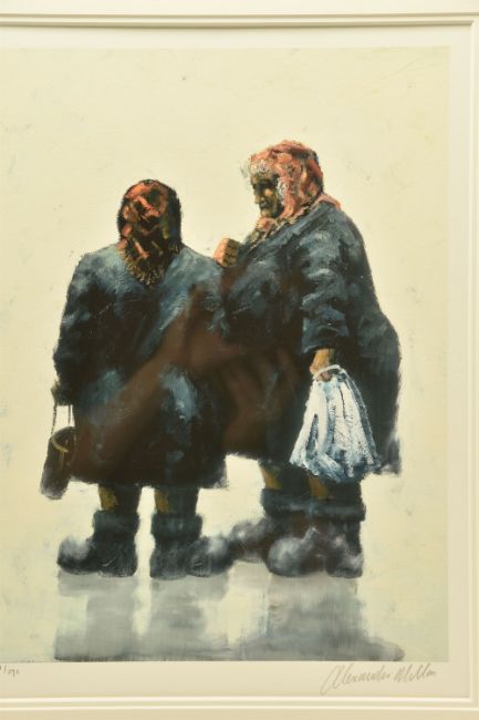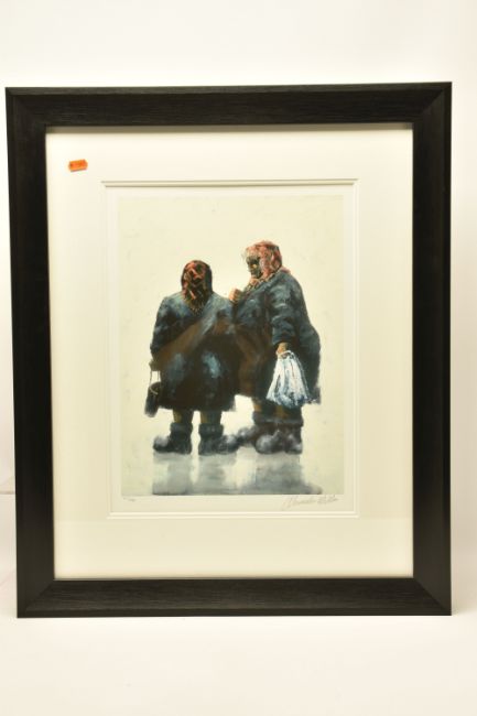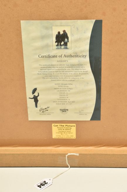 ALEXANDER MILLAR (SCOTLAND 1960) 'GOSSIPS', a signed limited edition print on paper, depicting two females talking together, 67/395 with certificate, approximate size 45cm x 33cm, frame size 71cm x 59cm, Condition Report: good condition