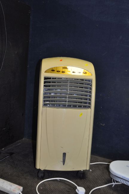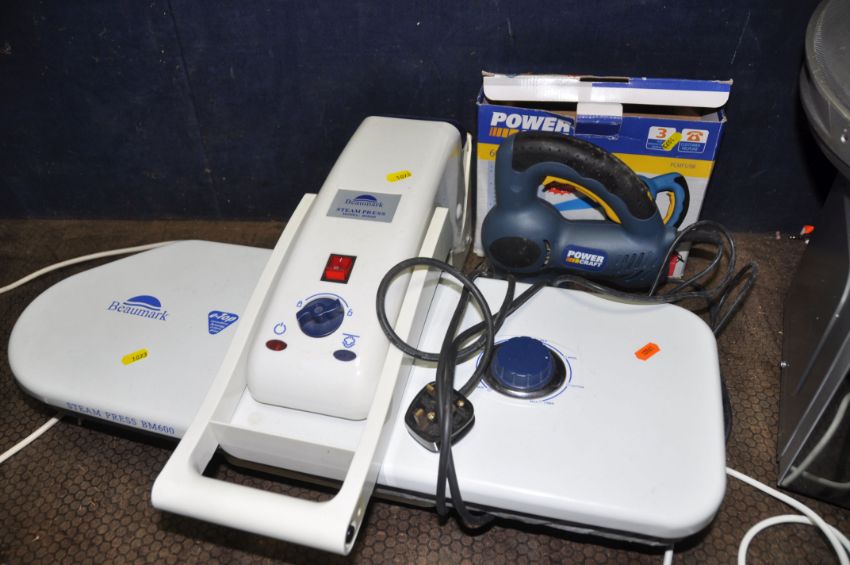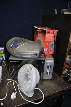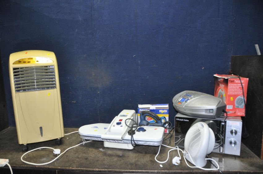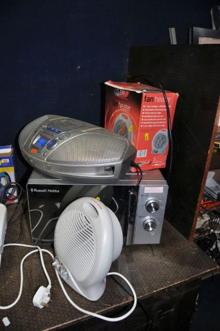 A SELECTION OF HOUSEHOLD ELECTRICALS including a Russell Hobbs microwave, a Panasonic portable hi fi, a Beaumark Steam Press, a Challenge dehumidifier, a Power Craft saw and a fan heater (all PAT pass and working)